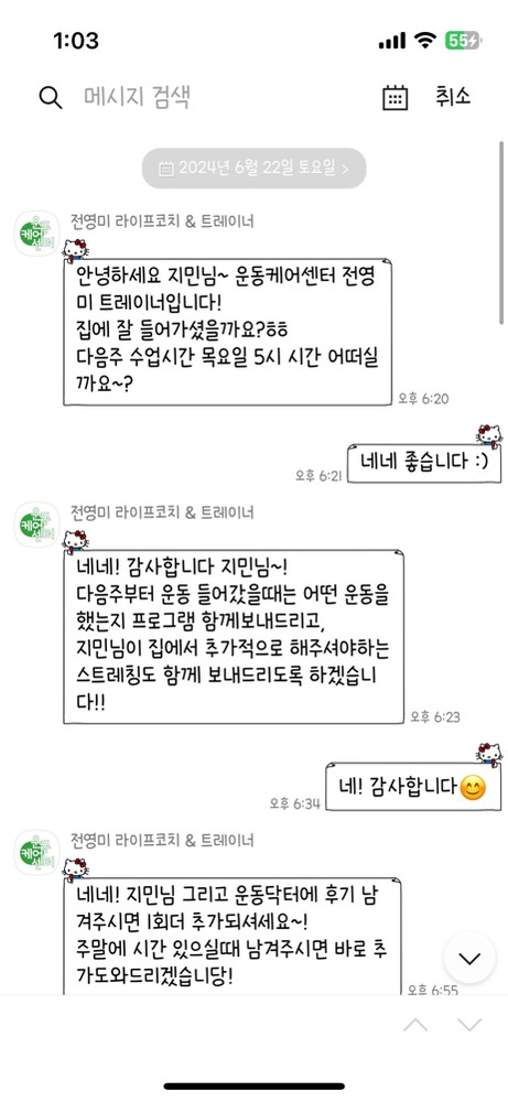 제 인생 첫 pt를 영미쌤과 함께해서 너무 좋았습니다😆😆 체험수업 받고 너무 좋아서 바로 다음 수업 등록했숩니당ㅎㅎ 운린이(?)라서 기구도 잘 모르고, 어떤 식으로 근육을 써야 하는지도 잘 몰랐는데, 영미쌤께서 하나하나 친절하게 알려주신 덕분에 조금씩 운동에 흥미를 가지게 되었어요🫶 무릎도 좋지 않아 처음 pt시작할 때도 걱정이 많았는데 충분히 근육도 풀어주시고, 무릎에 많이 무리가 가지않도록 커리큘럼을 짜주셔서 한 번도 아프지 않고 건강하게 운동했습니다☺️☺️ 이것저것 일에 치여 그동안 저를 돌보지 못했는데 마지막 힘까지 끌어모아 운동을 마치고 난 후에는 온전히 '나'를 위한 시간을 보냈다는 생각이 들어 뿌듯했습니다 :) 단순히 운동을 가르쳐주시는 것을 넘어 저에게 새로운 재미를 찾게 해주셔서 감사합니다 영미쌤🫶 PT를 고민하고 계신 분들께 무조건! 추천합니다👍👍