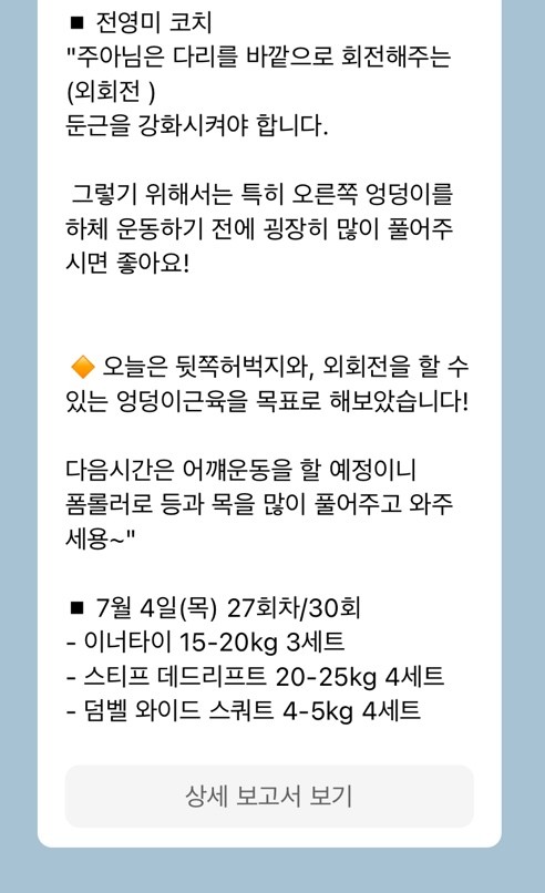 거의 6개월정도 피티 받고 십키로 정도 감량했습니다 ㅜㅜ 선생님께 너무너무 감사드립니다 천천히 다이어트 시켜주시고 항상 운동전, 후 마사지? 도 해주셔서 너무 너무 좋았습니다 운동 정말정말 싫지만 선생님과의 운동 너무 좋았어요 다리 다치고 이사문제로 연장은 못했지만 ㅠ 돌아온다면 다시 운동 하고싶어요!!!🫶🏻🫶🏻