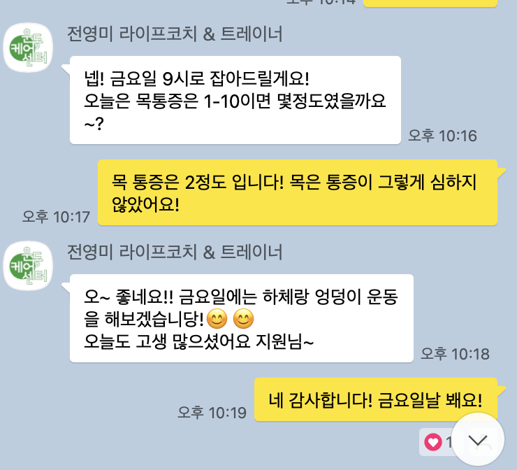 우리 수현님~ 그동안 목이랑 어깨통증 때문에 일상생활이 힘드셨죠ㅠㅠ 고생 많으셨어요. 이제는 알려드렸던 스트레칭과 자가적으로 관리할수 있는 방법으로 두통없는 하루하루를 보내셨으면 합니다! 건강한 나날 보내시다가 다시 움직임이 필요하실때 편하게 연락주세요 수현님~!