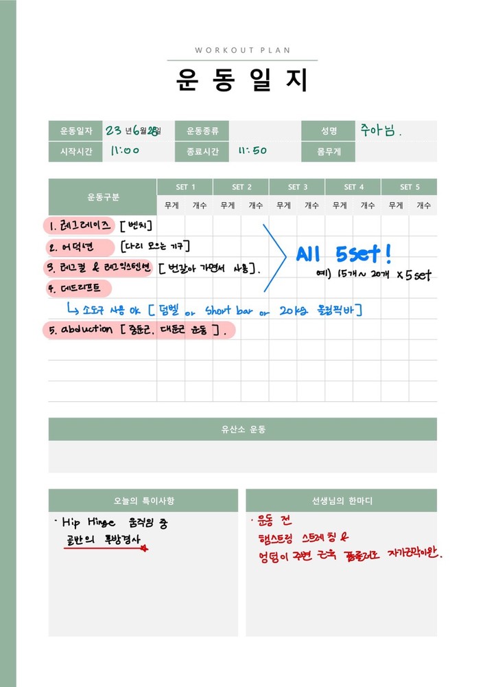 늦은 시간 빠짐없이 나와주신 우리 지원님💛 퇴근 후 오는 운동이 결코 쉬운일이 아닌데 , 한번도 빠짐없이 수업에 참여해주셔서 진심으로 감사드립니다 !! 운동 뿐만 아니라 교정해야하는 생활습관을 지원님께서도 신경 써주셔서 더 빨리 통증이 좋아졌던것 같아요 이사하신 곳에서 운동 꾸준히 해주신 다음에, 궁금하거나 안되는 부분 있으실 때 저를 다시 불러주세요 지원님😎 통증이 다시 올라오는 것 같으면 보내드린 일지 보시면서 꼭 복습해주세용~~ 건강한 하루를 보낼수 있게 늘 지원님을 응원하겠습니다 감사합니다💚
