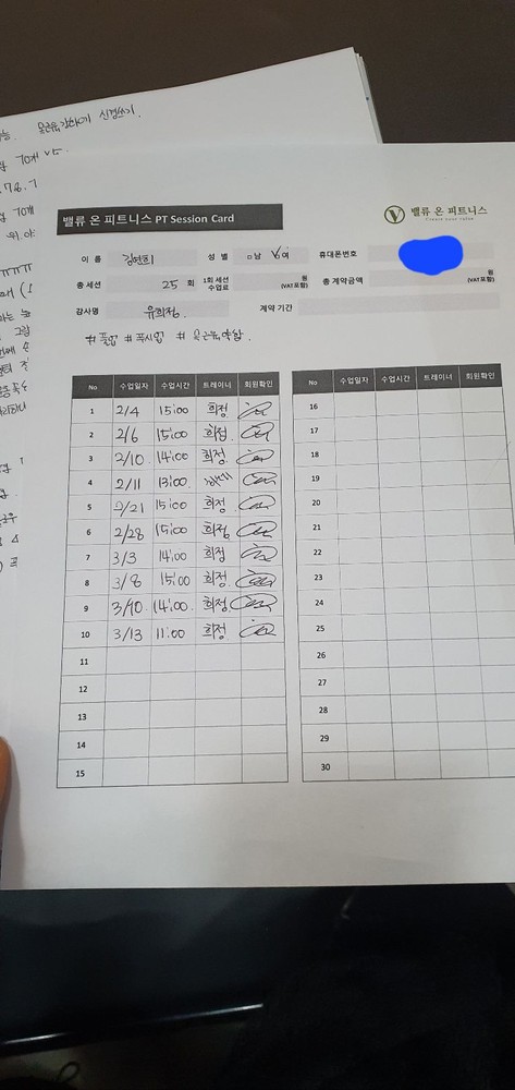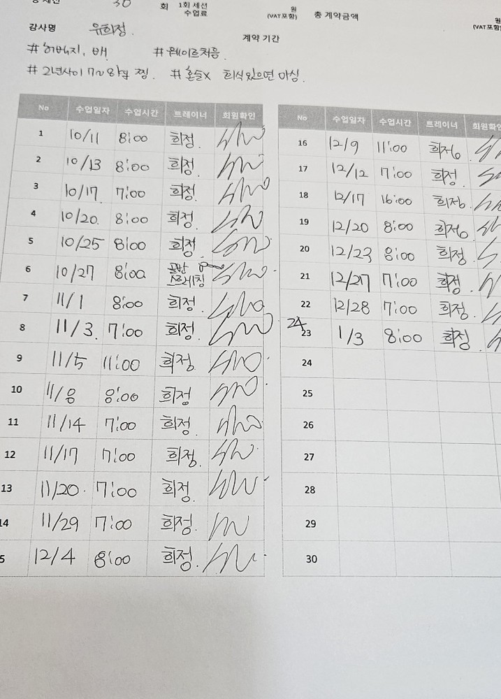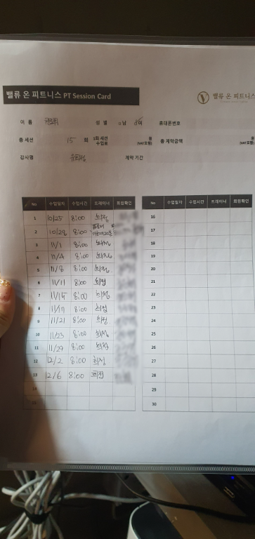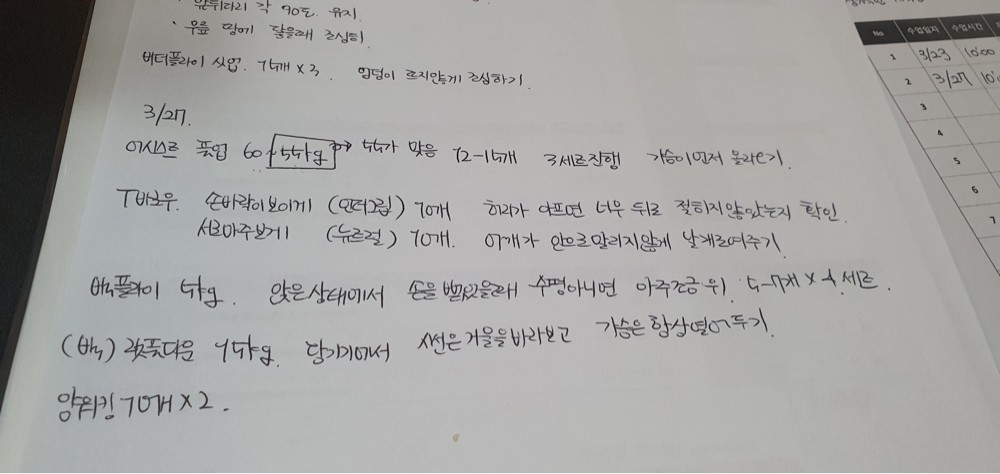 식단체크도 도와주시고, 수업 끝나면 복습할 수 있도록 적어주시는 운동 일지도 도움이 많이 됩니다.