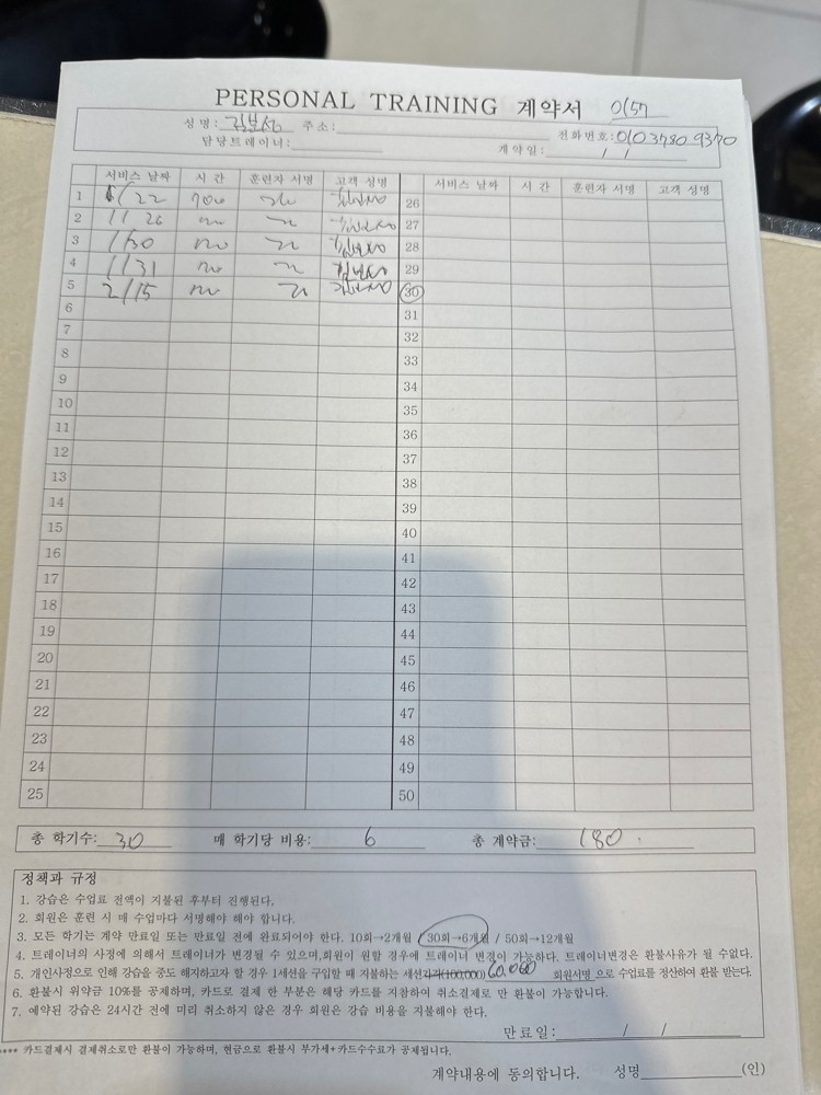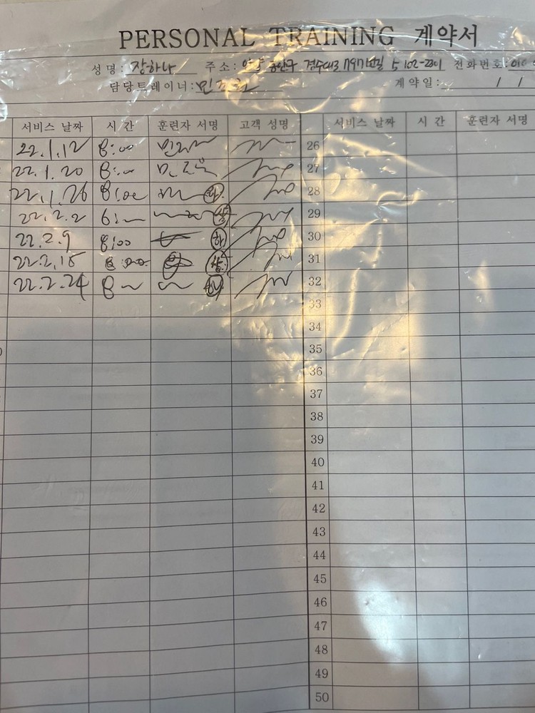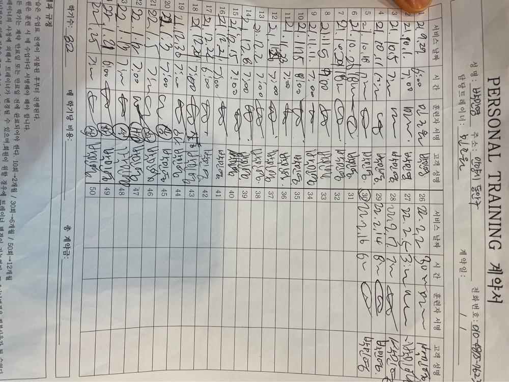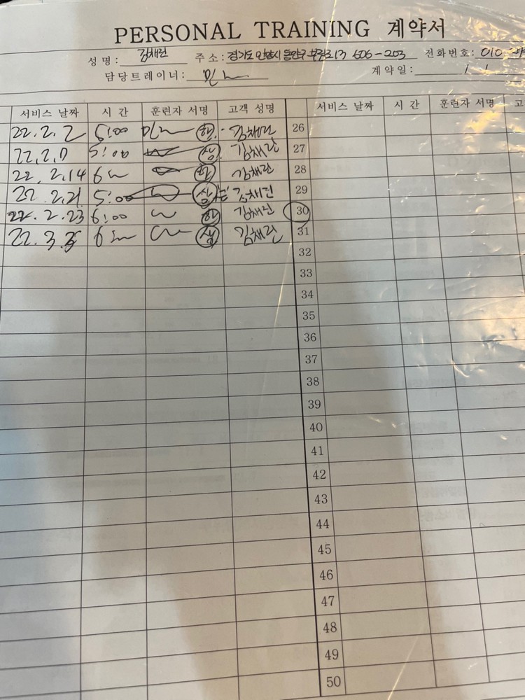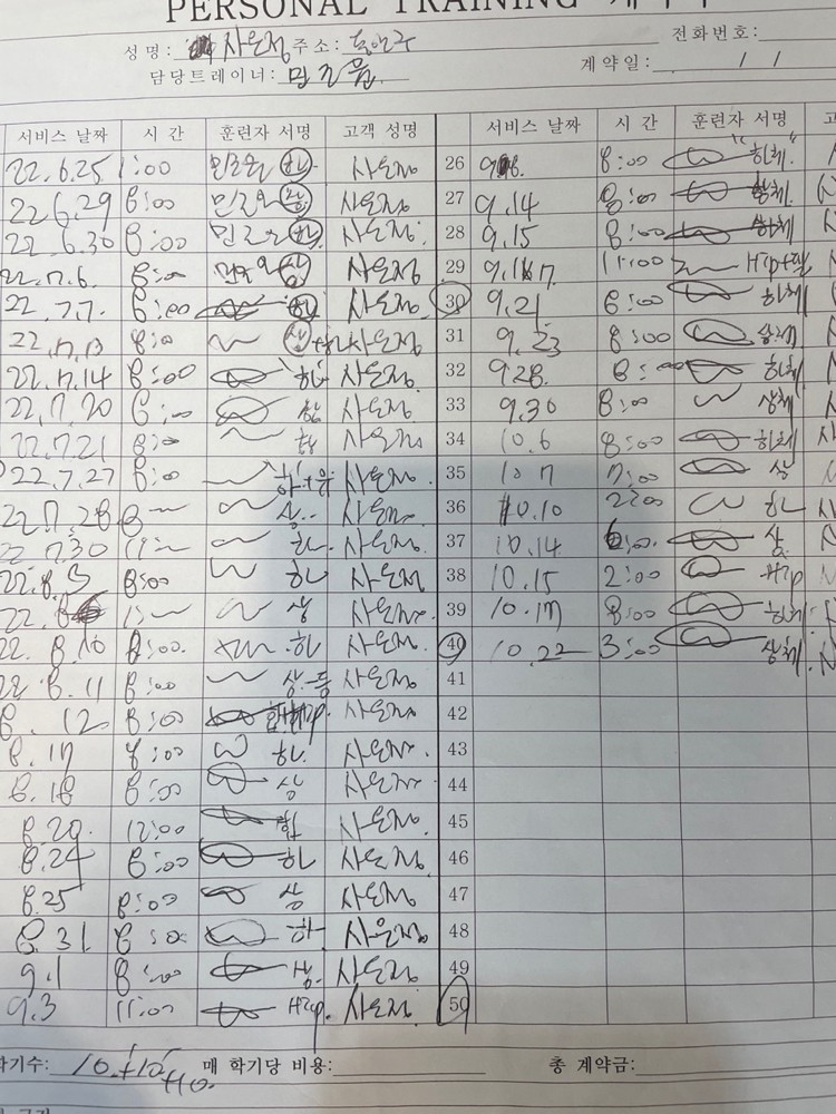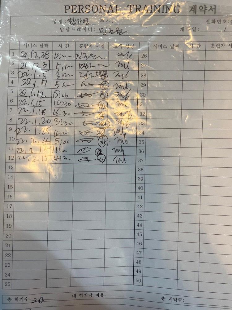 집에서 할 수 있는 운동, 스트레칭들도 잘 알려주시고 몸이나 컨디션에 맞게 프로그램을 짜주셔서 아프지 않게 운동 잘 받고 있습니당선생님과 함께 채워나가는 뿌듯한 싸인!! 예쁜 몸을 가지고 싶다는 욕심으로 시작했는데 확실히 몇 개월 지난 지금은 잔병치례도 없고 건강해졌어요!! 피티는 완전 처음이어서 낯설고 조금 겁도나기도 했는데 지금은 전.혀. 그런 두려움 1도 없어요!