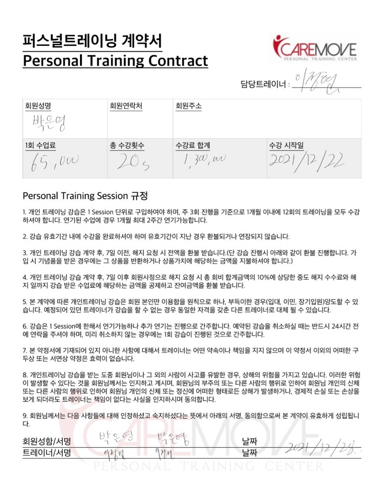 아직 운동을 시작한 지 얼마 되지 않았지만 선생님이 알려주신 스트레칭을 꾸준히 하며 목 통증과 어깨 통증이 많이 개선되었고 운동을 통해 활력이 생기며 건강한 일상을 조금씩 찾아가고 있어 요즘 운동하러 가는 날이 기대됩니다!상담받은 날 바로 등록을 했어요. 역시나!! 최고의 선택이었습니다!20회 가까이 운동하며 선생님께 많이 배우며 즐겁게 운동 중이거든요!