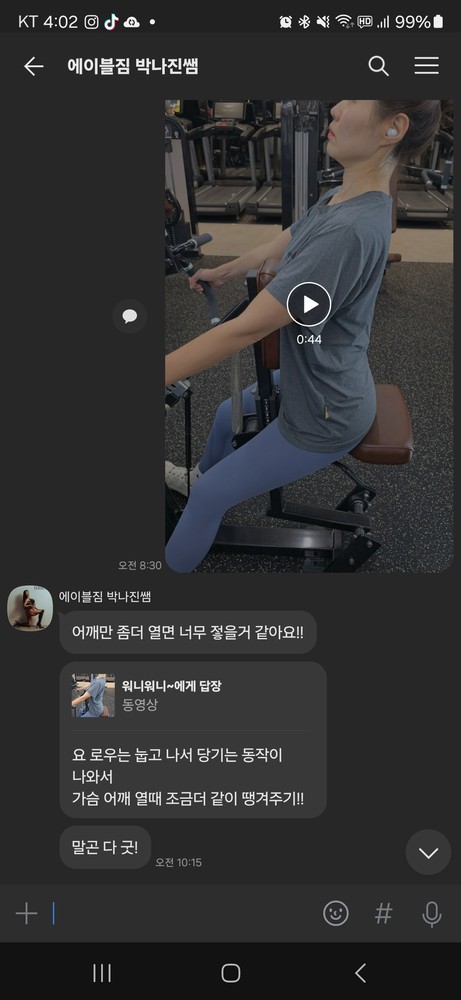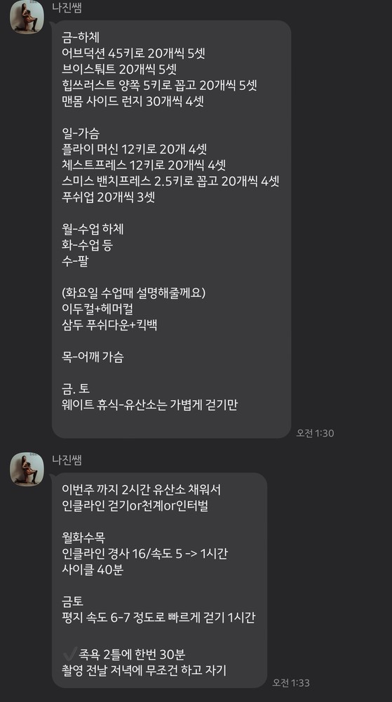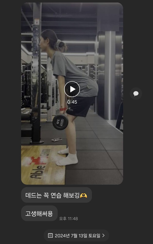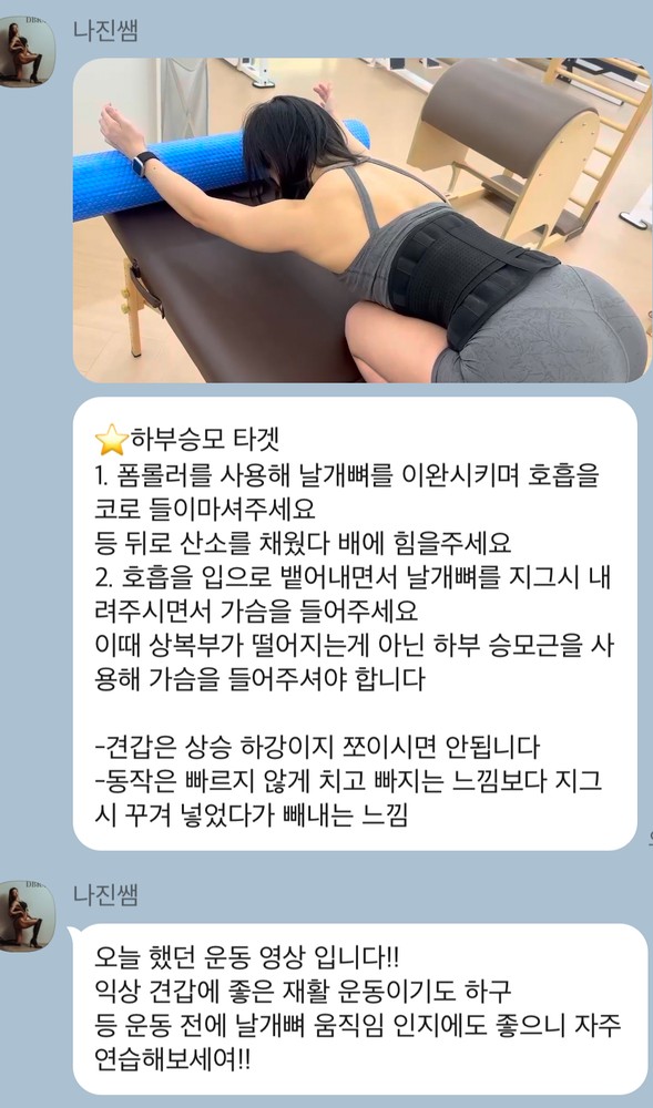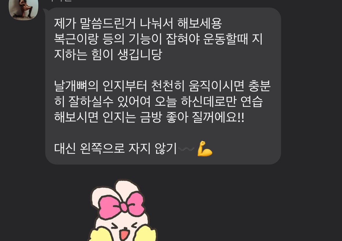 항상 동작이 잘되고 있는지 영상으로 남겨주시고 개인적 일정으로 운동 잠시 쉴때도 집에서 할수 있는 운동 영상 찍어 보내주셔서 감동이었어요 ㅎㅎ