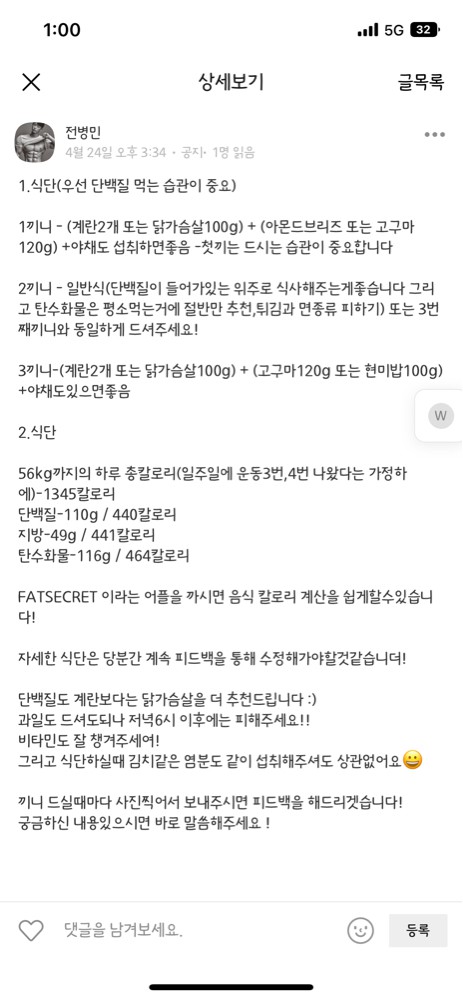 👉식단이면 식단, 그외 궁금한것들에 대해서 엄청 자세하게 알려주세요. 많은 전문 트레이터 쌤들이 많지만 병민쌤만의 섬세함이 있는듯요ㅠㅠ 누가 남자는 섬세하지 않다했나요! 거짓말일세!