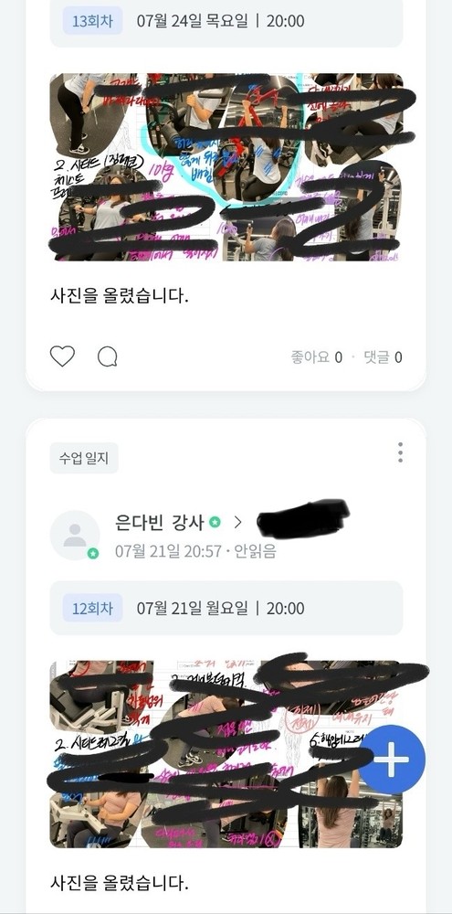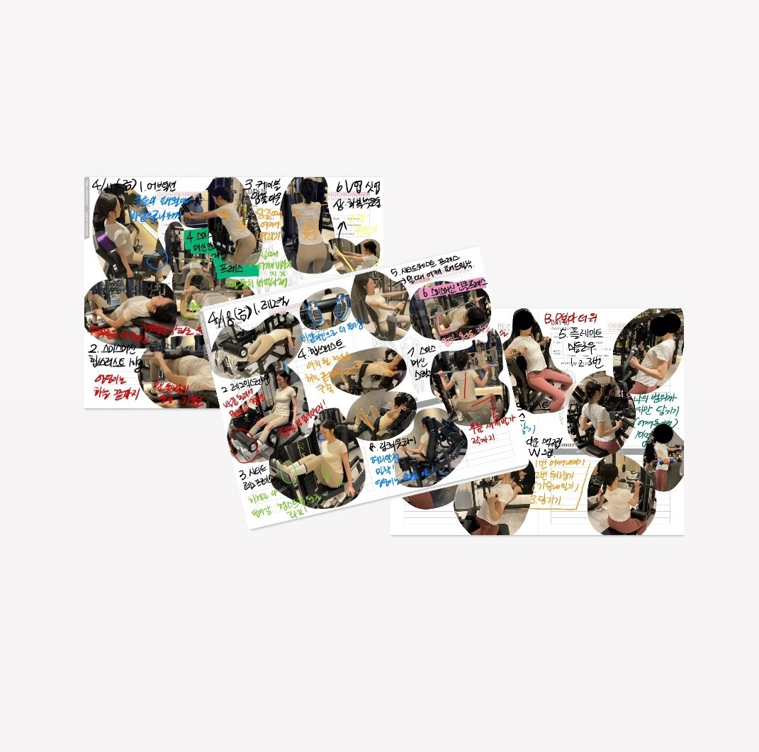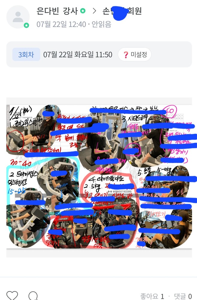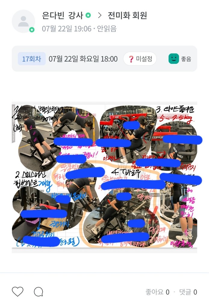 한 수업에 6개 운동 × 3세트로 구성돼서 빡세긴 하지만 그만큼 효과가 확실합니다. 매번 사진도 찍어주시고, 설명도 잘 적어주셔서 기억하기도 쉽구요.