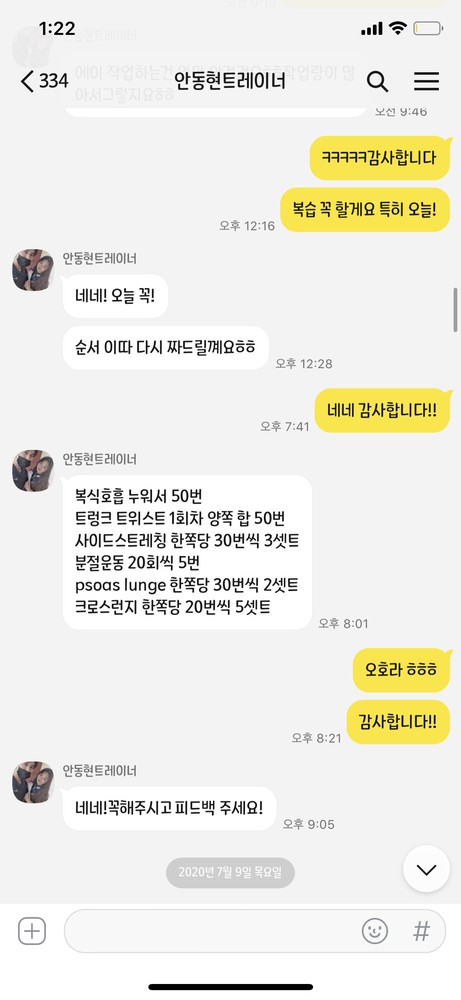 제 몸 상태에 따라 꼼꼼히 체크해서 맞춤 운동으로 해주시고 또 그걸 일일이 영상에 피드백까지 추가해서 넣어주시더라구요!