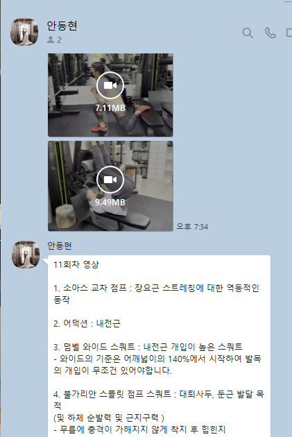 3. PT를 받는 모든 회차에 대해 영상을 녹화/편집해서 보내주십니다. 이걸 통해 어떤 동작을 배웠고, 동작마다 무엇을 유념해야 하는지 상기할 수 있습니다.