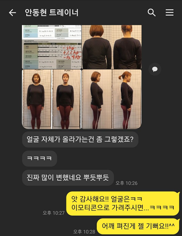컴퓨터 앞에 오래 앉아계시는 분들께 강력 추천 드립니다.예전엔 운동은 어려운 거라고만 생각했는데, 이번에 체력을 쌓아가며 변화를 확실히 느끼고 더 열심히 하게 됩니다. 피티를 받기 전엔 자리에서 일어나지 못할 정도로 근육이 빠져 있어서 일상생활 자체가 힘들었는데, 한달 반이 지난 지금은 컨디션이 너무 좋아져서 약속이 많아졌어요.