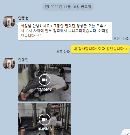 제 운동 영상을 찍어서 보내주시니까, 피티가 아닌 개인운동 때도 참고하여 볼 수 있어서 혼자 하는 운동을 훨씬 수월하게 할 수 있었습니다.