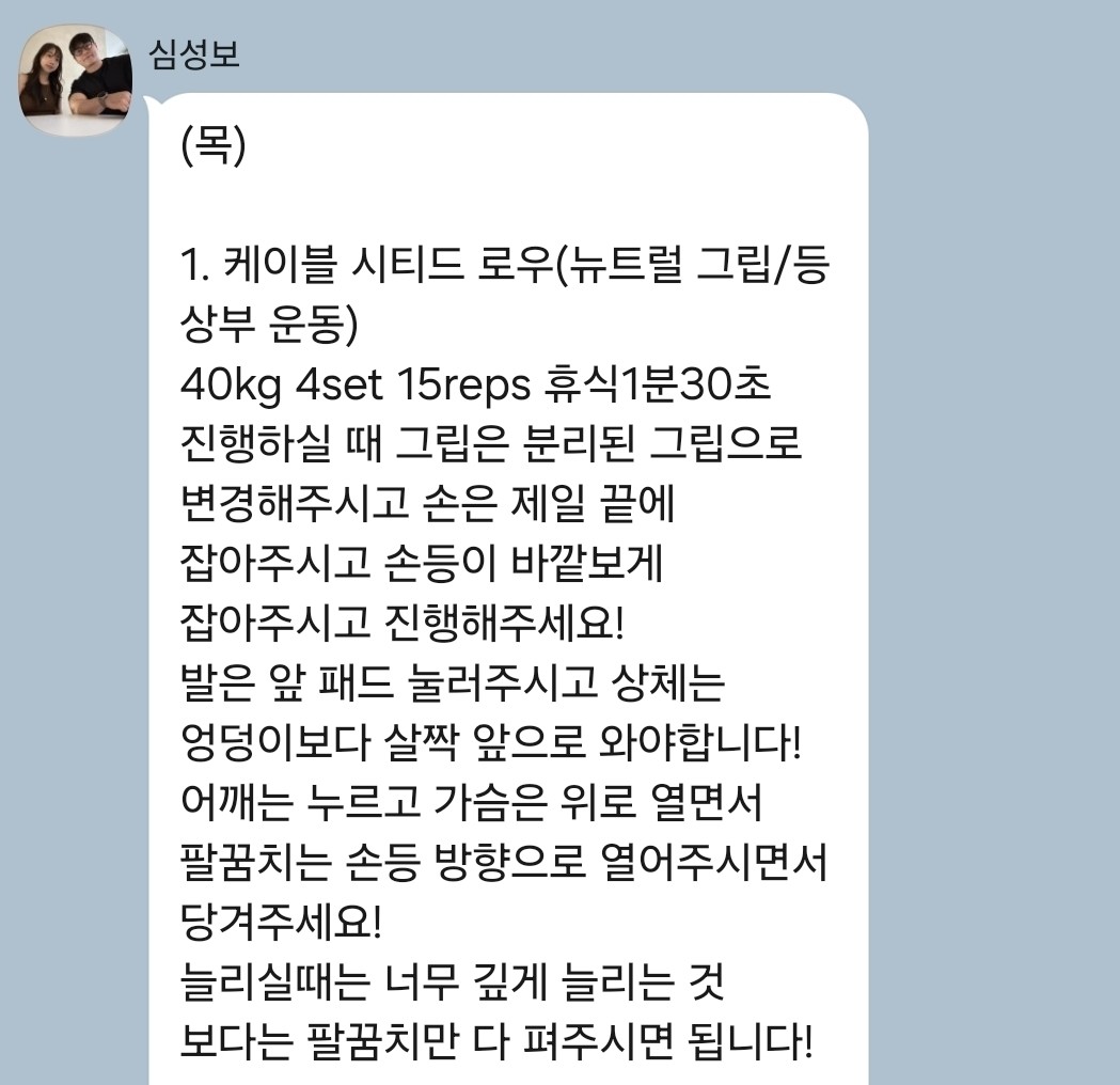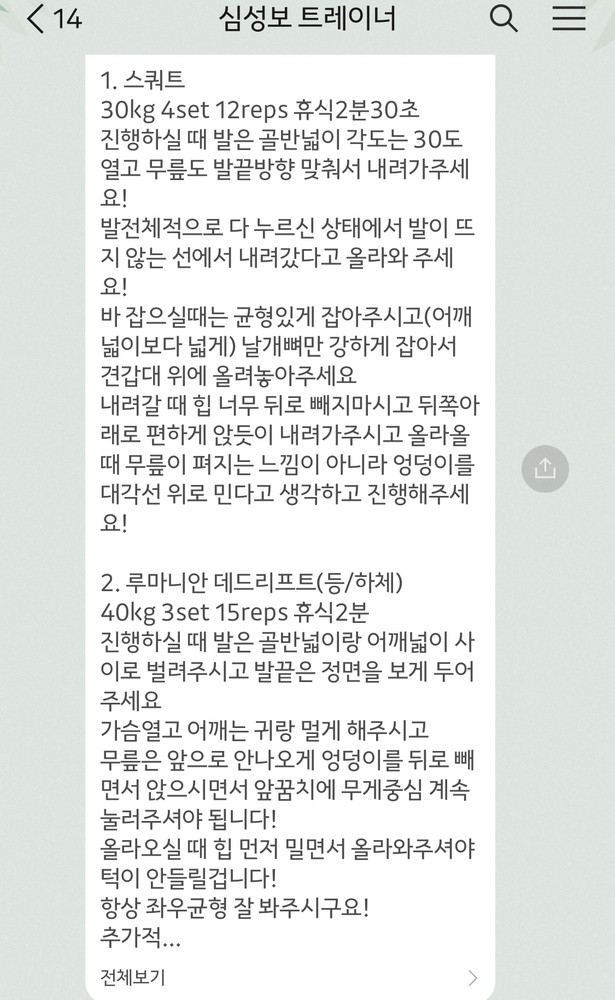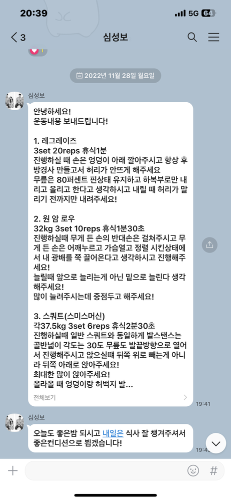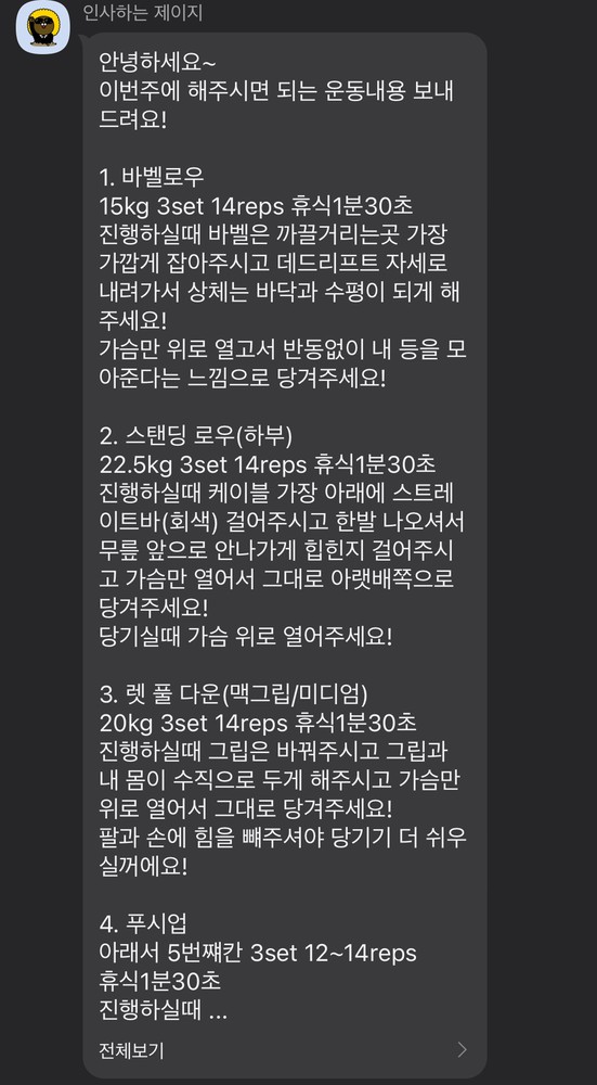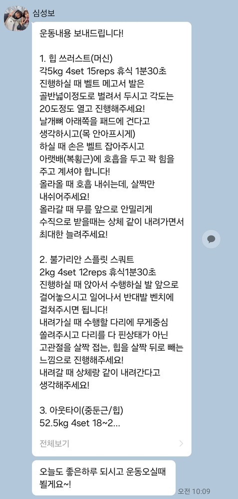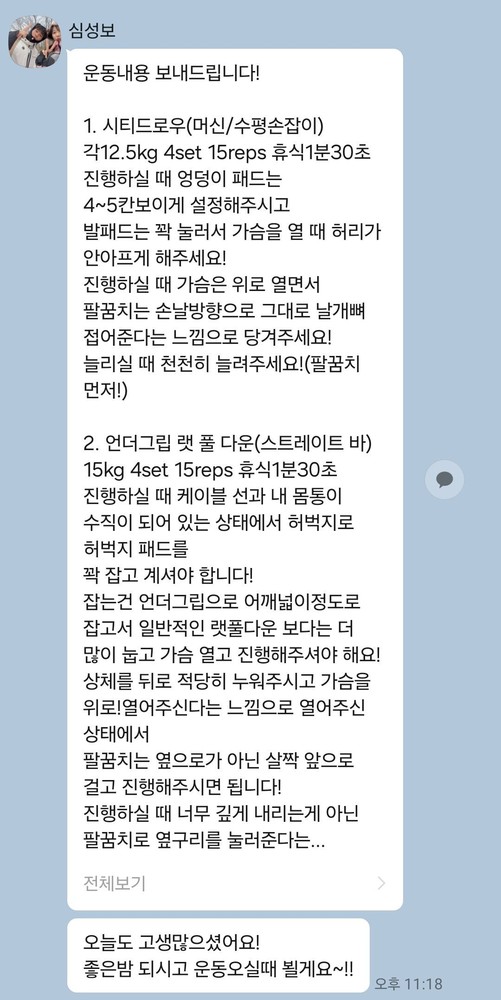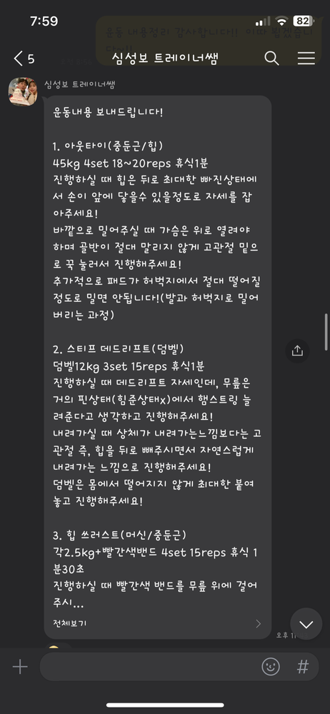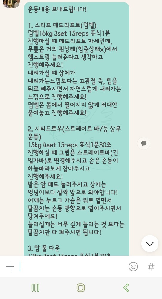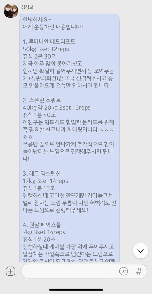 걱정했던게 무색할만큼 지금은 선생님 덕분에 웨이트에 흥미를 많이 붙이게 됐어요! 수업 끝날때마다 그날 했었던 운동을 카톡으로 보내주셔서 개인운동 할 때도 덜 헤맸던 것 같아요.