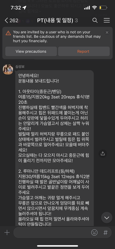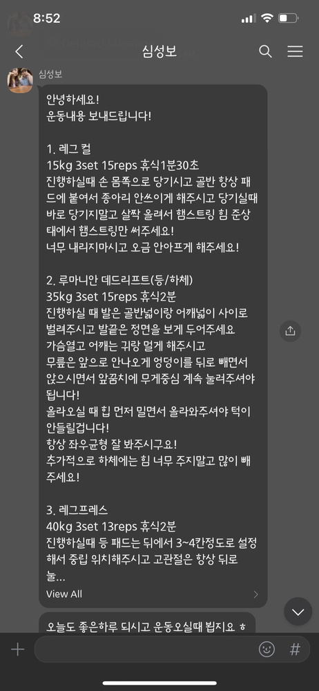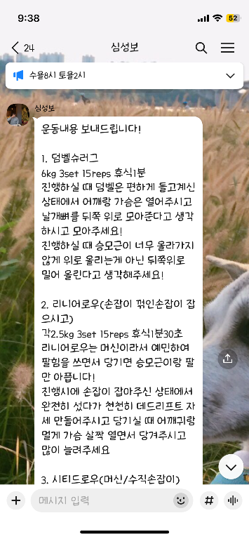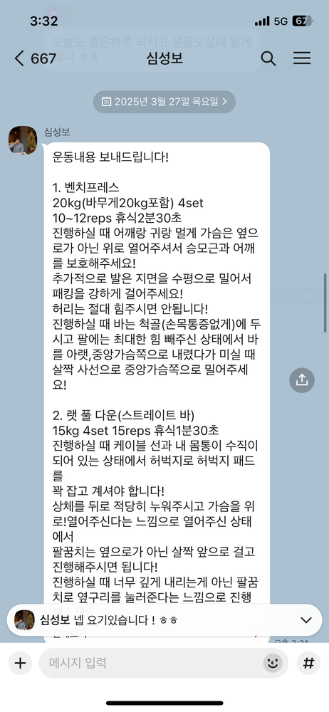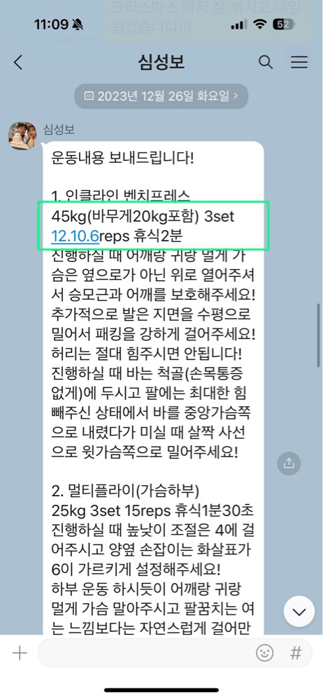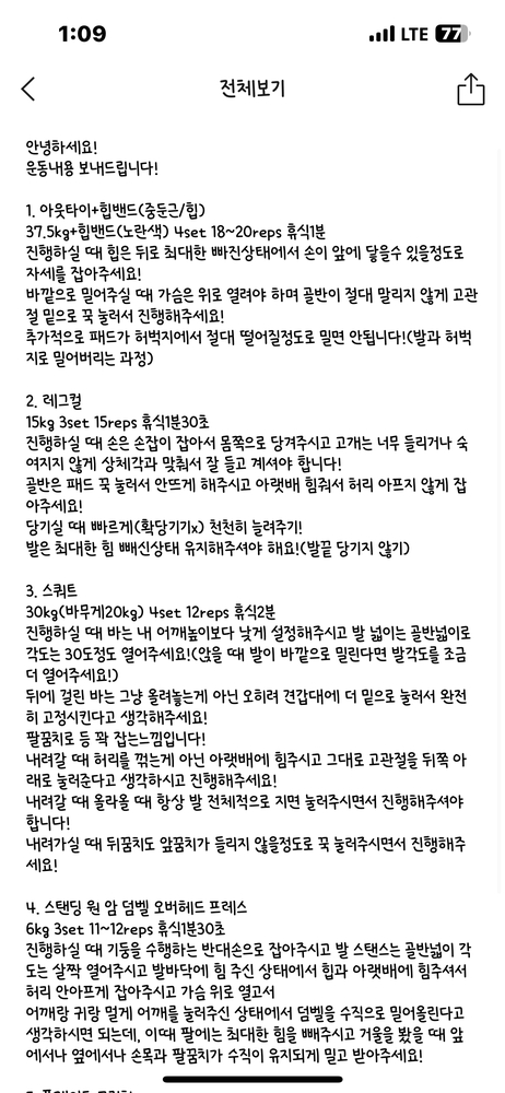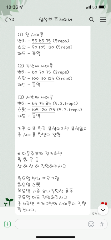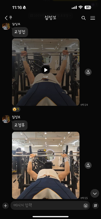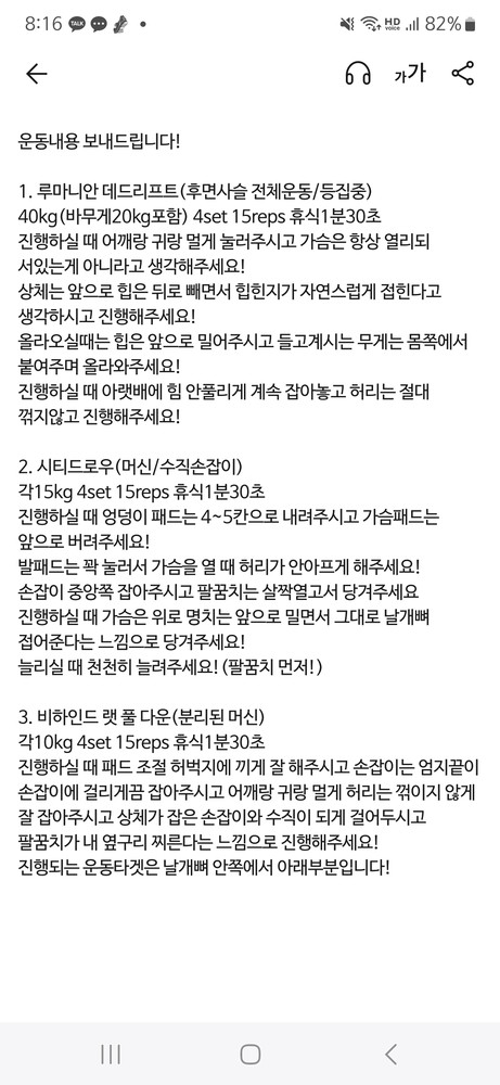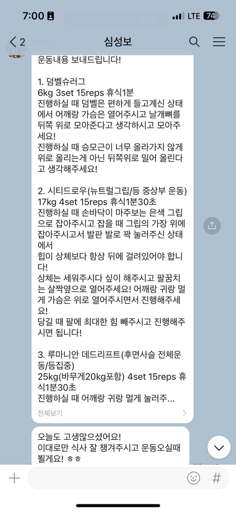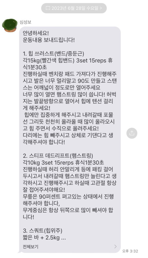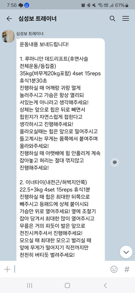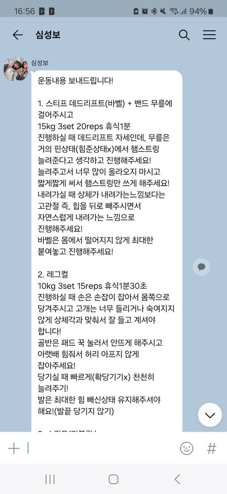 걱정했던게 무색할만큼 지금은 선생님 덕분에 웨이트에 흥미를 많이 붙이게 됐어요! 수업 끝날때마다 그날 했었던 운동을 카톡으로 보내주셔서 개인운동 할 때도 덜 헤맸던 것 같아요.