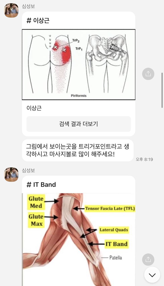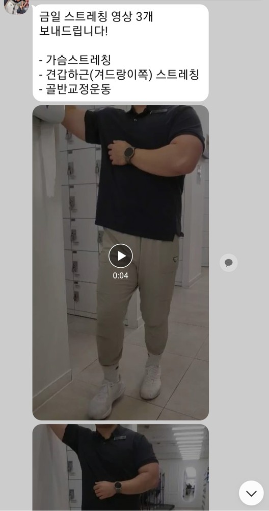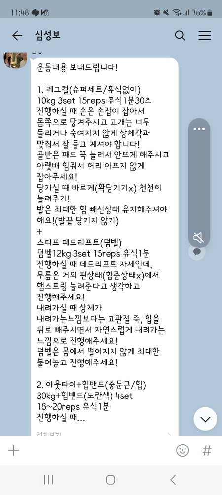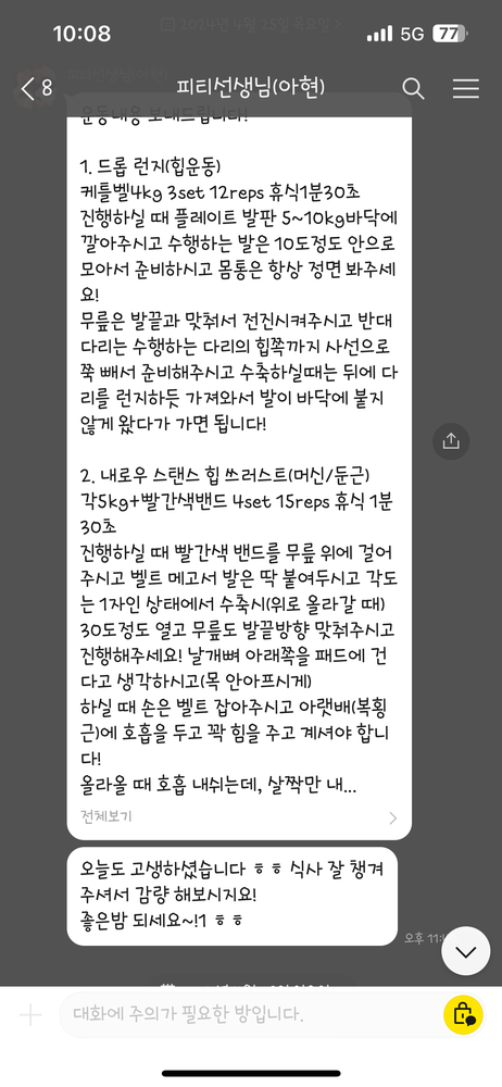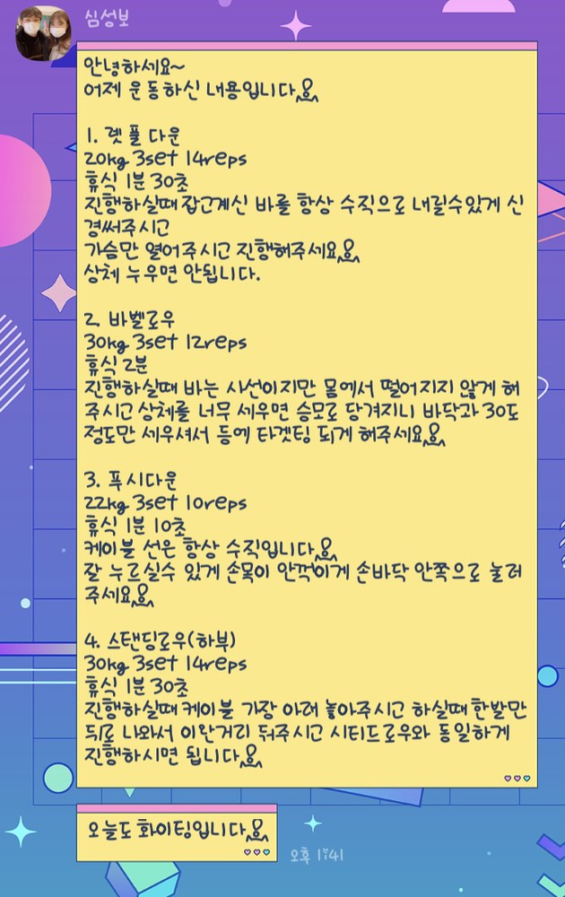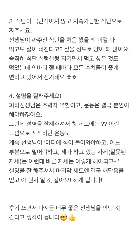 하고나면 운동법이 좀 가물가물한데 했던 운동들을 정리해서 보내주시고 특히 스트레칭법은 직접 영상으로 찍어보내주셔서 넘 감동이었어요. 열심히 안 할수가 없어요ㅎ 제가 잘 못하지만 늘 격려와 칭찬을 아끼지 않고 해주셔서 즐겁게 운동하고 있습니다. 완전강추합니다.쌤이랑 운동한지 거의 1년 다 되어가네요.