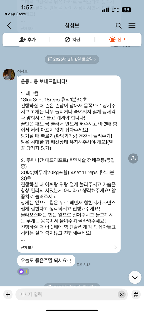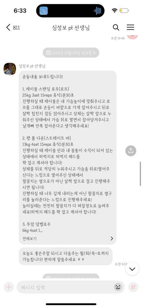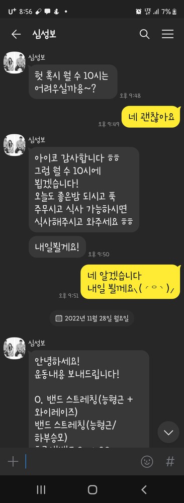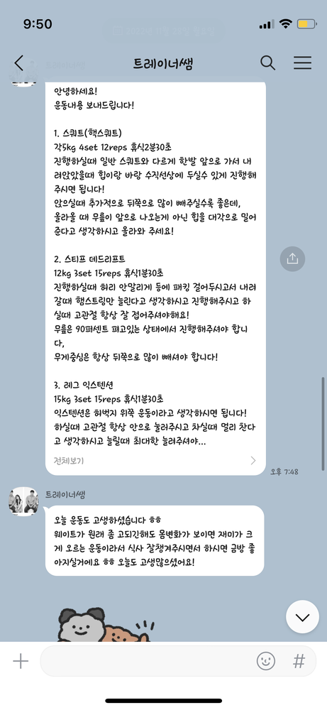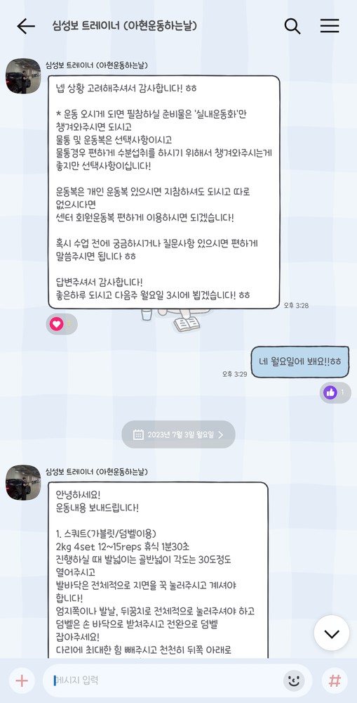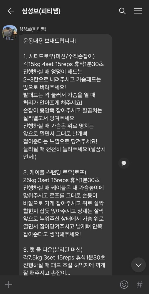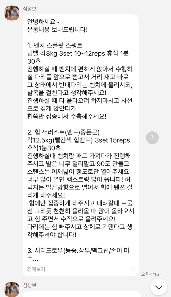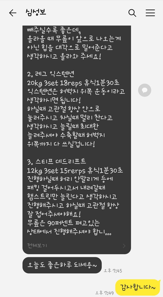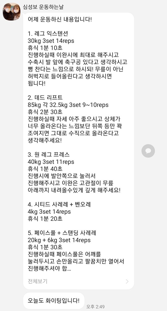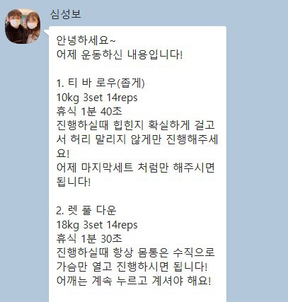 또한 당일 수업이 끝나면 그날 수행한 운동 내용을 작성해서 보내주십니다.