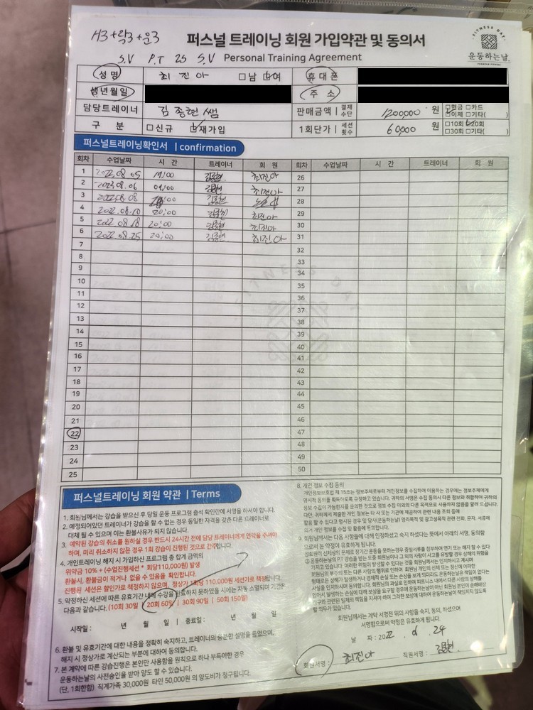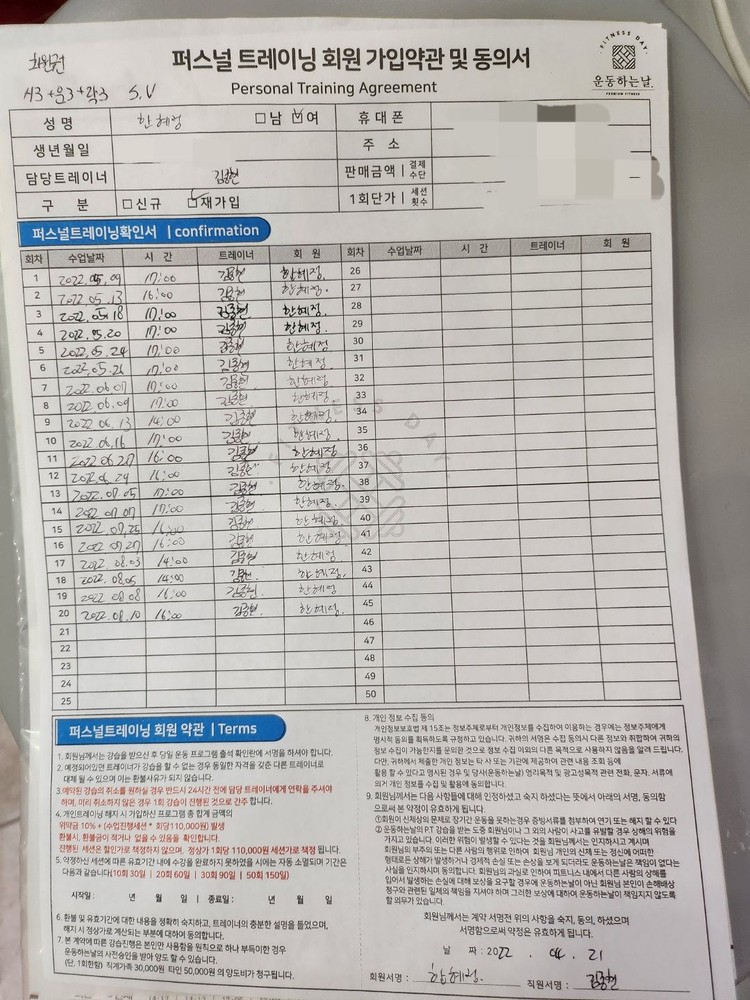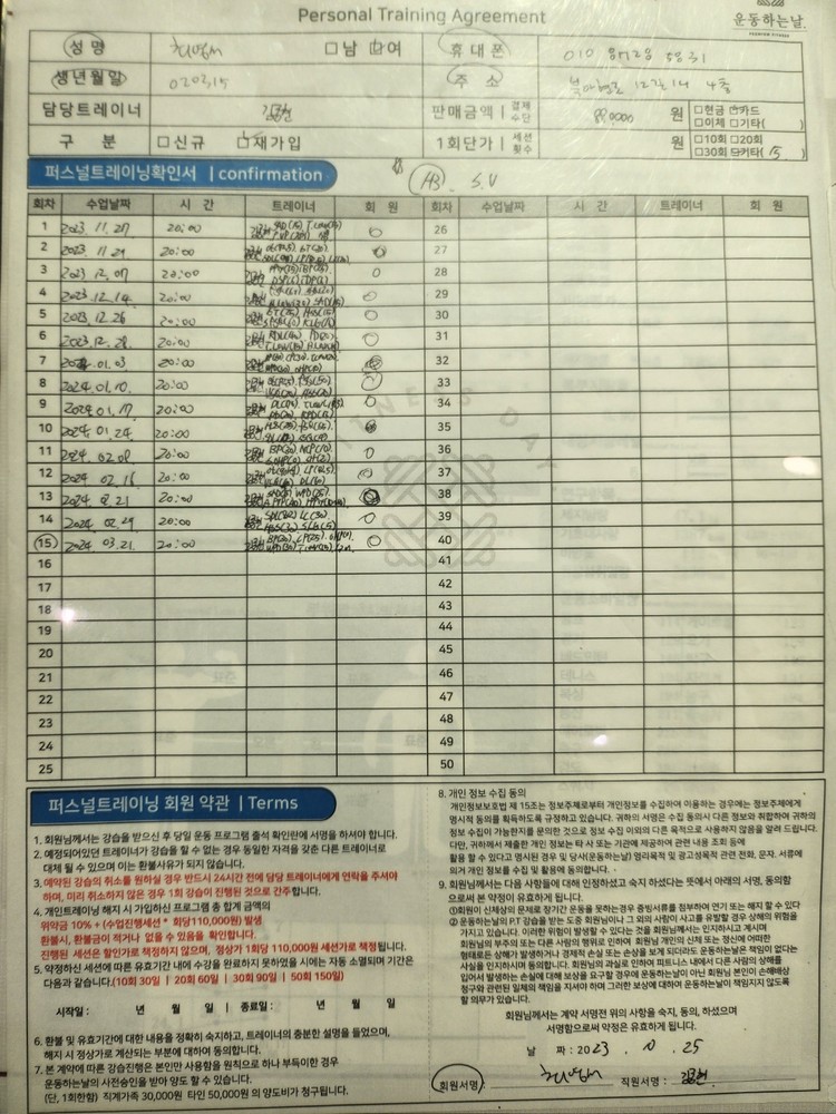 1. 시간 약속에 대한 것은 말할 것도 없고, 매일 운동 일지를 기록하심으로써 저의 상태와 컨디션에 맞는 프로그램으로 연속성있게 진행해주십니다.