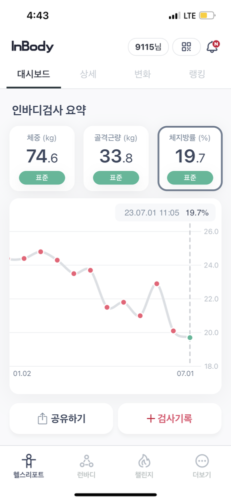허리 다 낫고 재등록하고 운동했더니 살면서 코어에 근육량이 평균이 되본 적이 없는데 처음으로 평균으로 올라갔어요!