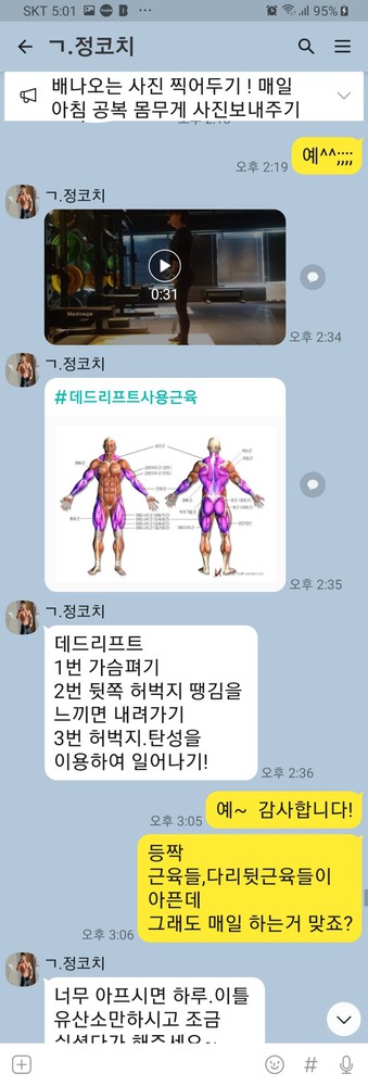 많은분들 후기에서 보다시피 그날그날 운동 기록은 물론 영상까지 보내주셔서 좋아요. 처음엔 스스로가 넘 부끄러워서 영상을 잘 못봤는데 점점 욕심이 생기니 보게되더라구요 ㅎㅎ