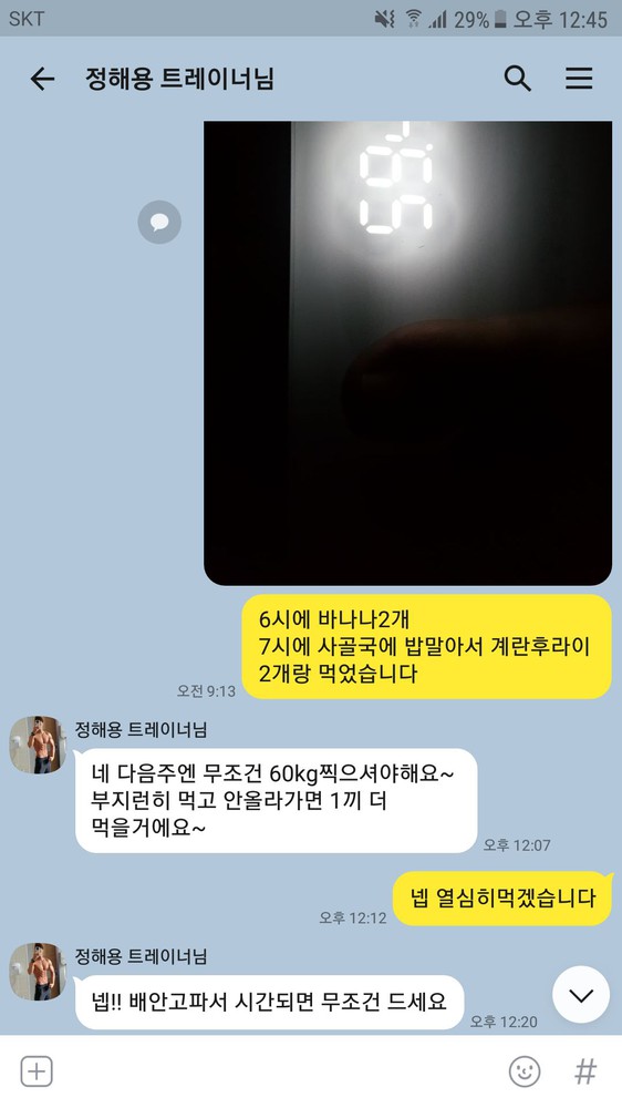 4. 매일매일 카톡으로 무너지지 않게 도와주십니다. 아침 공복 체중과 삼시세끼 식단관리 매일 세심하게 봐주시고 관리 해주십니다^^인생첫복근+바디프로필 성공! 혼자 운동한지 3개월차, 의지가 떨어질때쯤 무료PT임에도 상세한 운동설명에 바로 20회를 등록하고 코칭받았다. 코로나로 센터 close와 촬영딜레이까지 멘탈이 무너질 수 있는 상황이 여러번 왔는데도 정신적 지주와 버팀목이 되어준 정코치님덕분에 가능했다. 가장 힘들었던 식단관리와 의지력, 2가지를 완벽 서포트 해주심!PT해봤던 쌤 중 역대급으로 관리를 잘 해주심👍👍