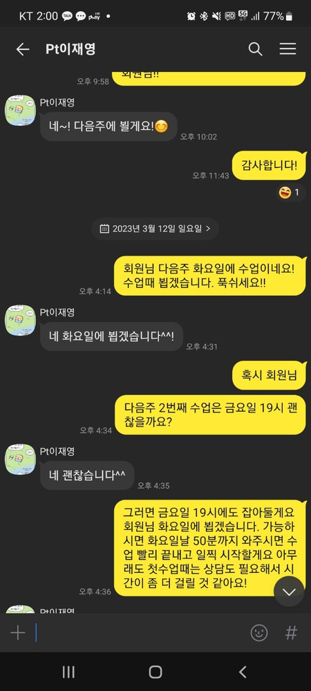 계속 신경 많이 써주시는 것도 느껴졌고 심지어 저도 제 몸에 대해 목표가 없는데ㅋㅋ 선생님께서 나름의 목표를 갖고 열심히 시켜주셔서 저도 열심히 할 수 있었어요!! 제가 원래 목표없고 될대로 돼라 스타일에 의욕도 잘 없는데 거부감 없이 정말 잘 이끌어주셔서 운동도 매일 나가고 있어요!~! 원래 운동하러 가는 길이 운동하는 것 보다 힘들잖아요.. 근데 쌤이랑 하니까 그냥 기계처럼 출석하고 운동해요ㅋㅋㅋㅋ 저 낯도 많이 가리는데 편하게 대해주셨어요!!