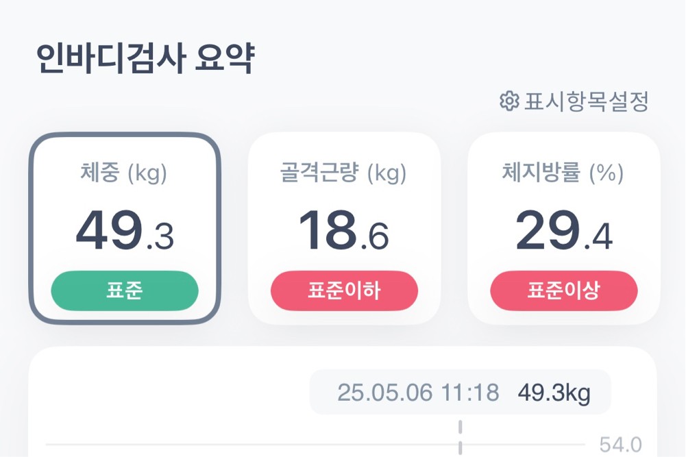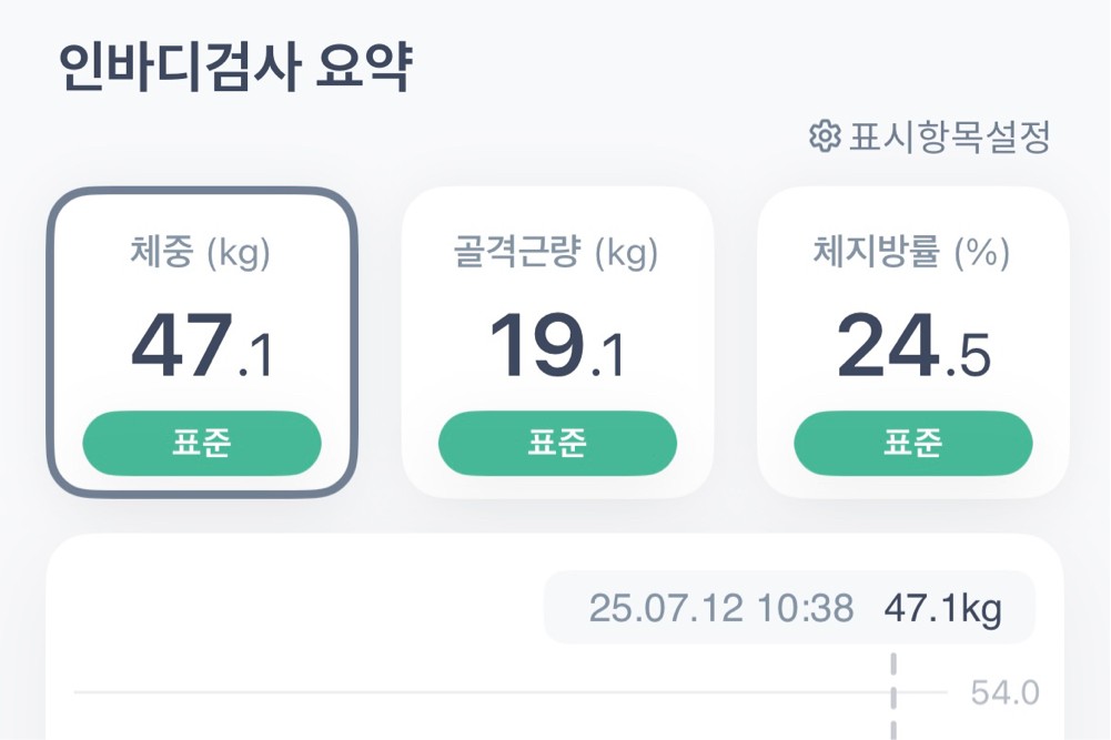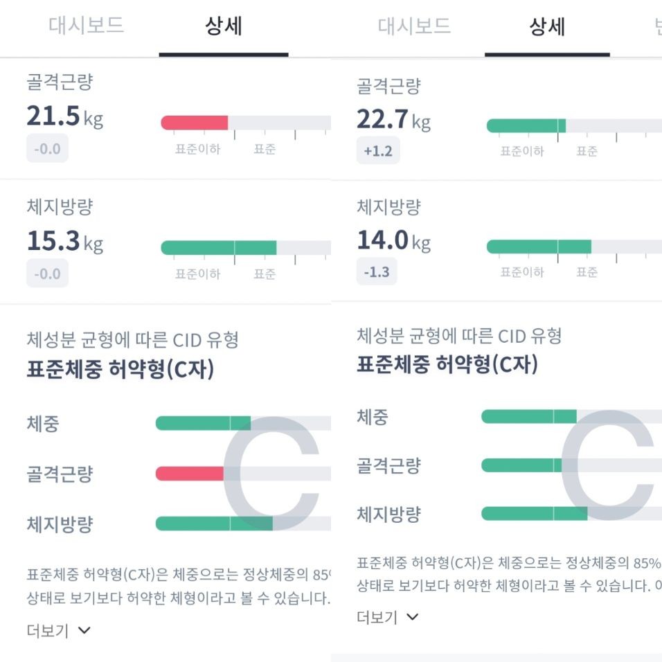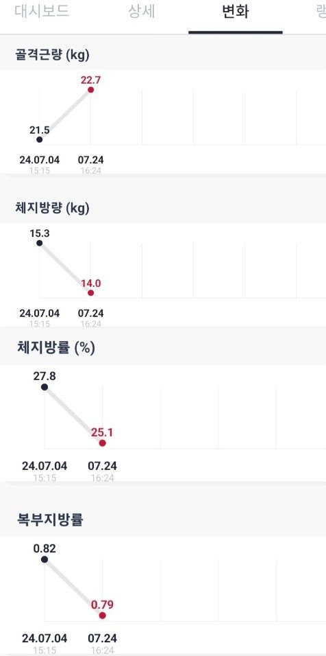 오늘 인바디 측정했는데 2주전에 77.1kg에서 74.4kg 골격근량 37kg에서 37kg, 체지방률 16%에서 12.8%이였어요