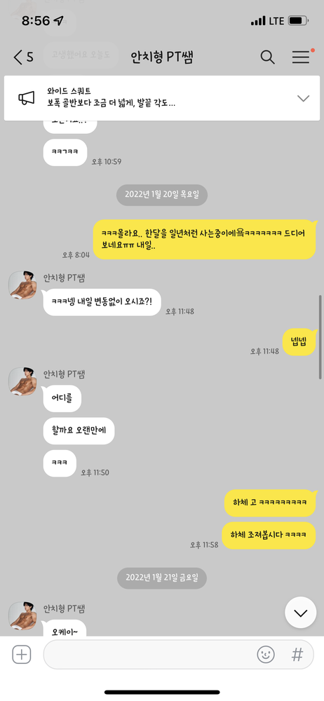 정말 감사해요!.!여러곳의 PT를 받아봤지만 너무 무리하거나, 체계적이지 못하거나, 소홀한 느낌이 들거나 하는 등의 이유로 재등록을 하지 않았지만 선생님 만나고는 운동하는게 거부감이 없고, 편하고 체계적으로 몸이 변하는걸 느껴서 꾸준하게 운동하는 중입니다! 감사해요 !몸도 운동하는 마음도 변하게 해주셔서! 알라뷰요운동을 너무 싫어하는 저에서 어느덧 40회째 안치형 선생님께 PT수업을 받고있네요.