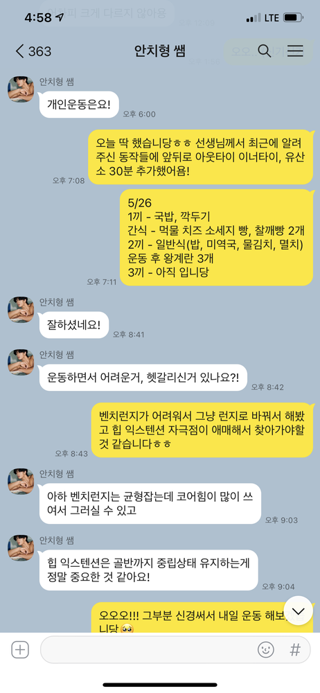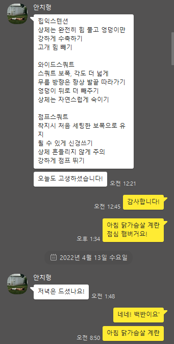 바쁘실텐데도 수업시간이 끝나면 그날 했던 운동들 정리해서 카톡으로 보내주시는데, 보면서 복습도 할 수 있고 혼자 운동할때도 보면서 하면 기억도 잘 나고 포인트도 잘 잡아서 집중할 수 있습니다 😀