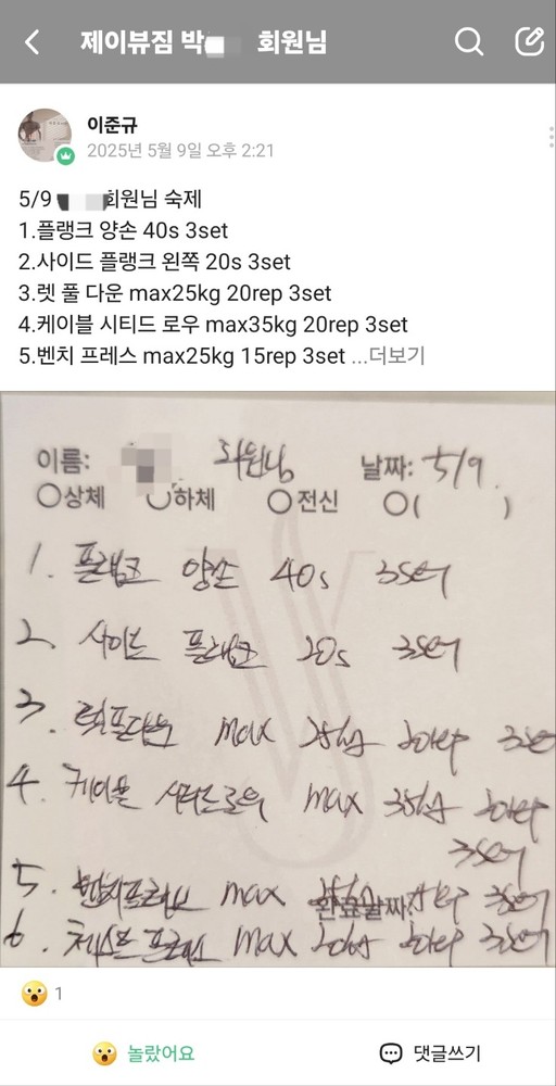 특히 다른 트레이너와 차이를 느끼셨다고 말씀해주셔서, 제가 추구하는 ‘개인 맞춤형 케어’의 방향이 잘 전달된 것 같아 기쁩니다.