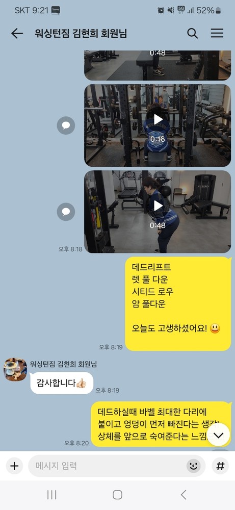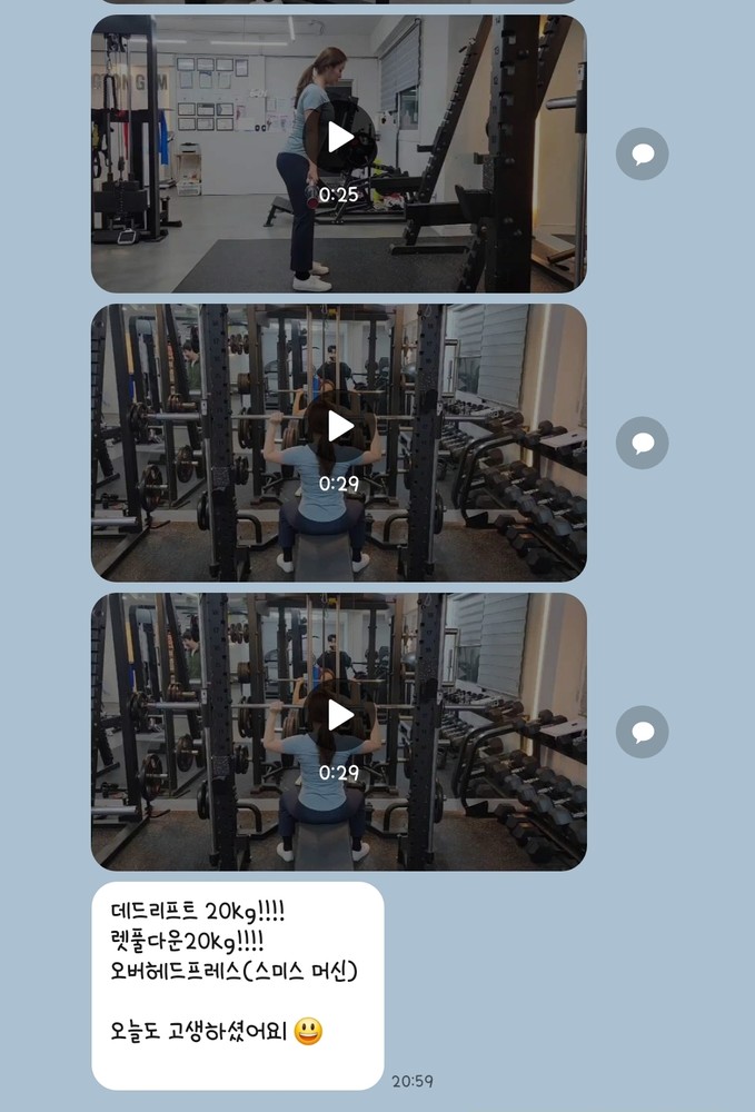 혼자서도 운동하실 수 있도록 영상 제공과 피드백을 드리는 점도 좋게 봐주셔서 감사드리며, 앞으로도 꾸준히 건강한 몸과 마음을 만드실 수 있도록 더욱 노력하겠습니다. 😊