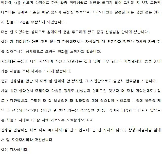 술로인해 급격하게 살이 붙었고 빼지못하고 몇년동안 유지하고있었는데 요즘 점점 몸을 보면서 자존감이 떨어졌어요 현직 물리치료사로 근무시간도 굉장히 길고 정신 육체적으로 피로가 너무 많아 사실 퇴근 후 운동이란걸 한다는게 마음먹기도 쉽지않았어요! 하지만 ㅜㅜ 더 이상 미루면 평생 이렇게 살것같아서 블로그를 통해 이준규쌤의 글을 보고 연락을 드려 꼼꼼하고 자세한 상담끝에 24회만 먼저 시작하게됐어요! 우선 채찍과 당근을 .. 주실줄 아는 분이세요 ㅋㅋㅋㅋㅋ냉철할땐 냉철하다가도 잘 챙겨주고 아픈곳도 생각해서 꼼꼼하게 가르쳐주셨어요! 물리치료사임에도 몸상태가 너무너무 좋지않고 의욕도 한없이 없는편이라 수업내내 힘드실텐데 항상 텐션 올려주려 하시고 신경써서 봐주십니당:-)