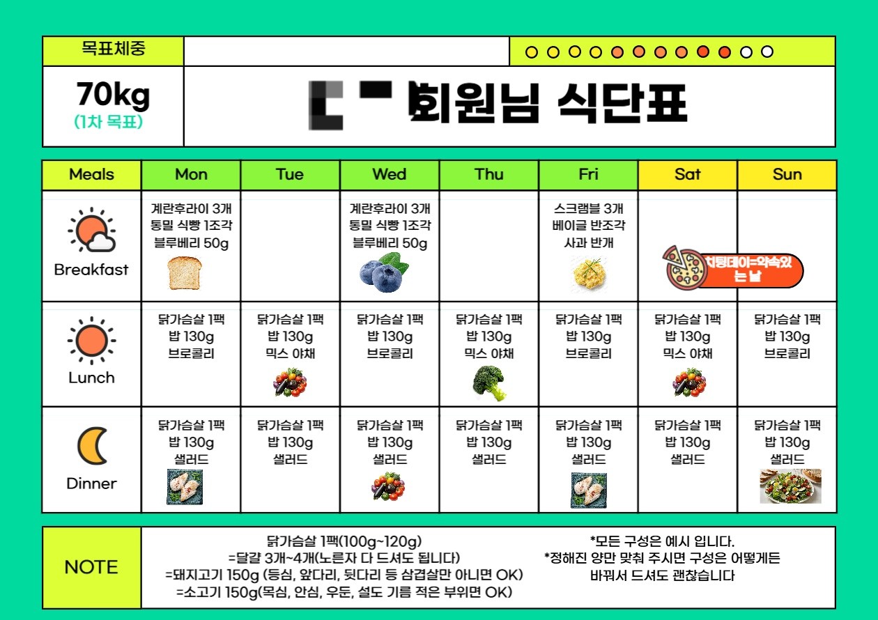 식단: 솔직히 피티받을때 가장 걱정했던거는 극단적으로 샐러드 먹이는거였는데 준규쌤은 일반식으로 먹되 식습관을 관리해줌으로 평소에 덜 부담되게 다이어트를 할 수 있게 해주는 점입니다. 이렇게 하니 오히려 제가 더 관리하게 되는 것도 있는거 같아요😆