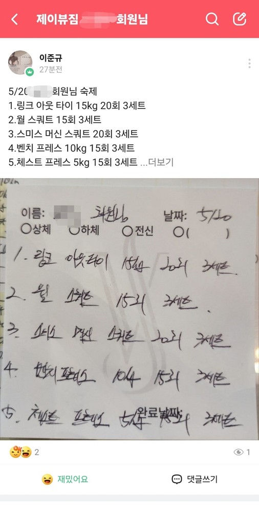 운동: 평소 운동습관과 성향등을 꼼꼼하게 상담해주셔서 개개인에게 맞춤으로 운동을 알려주셔서 좋았고 칭찬지옥에 가둬서 운동에 대해 자신감을 가지게 해주세요! 그리고 숙제도 별도로 내주셔서 헬스장 갈때 개인운동하기 매우매우 편합니당🙂