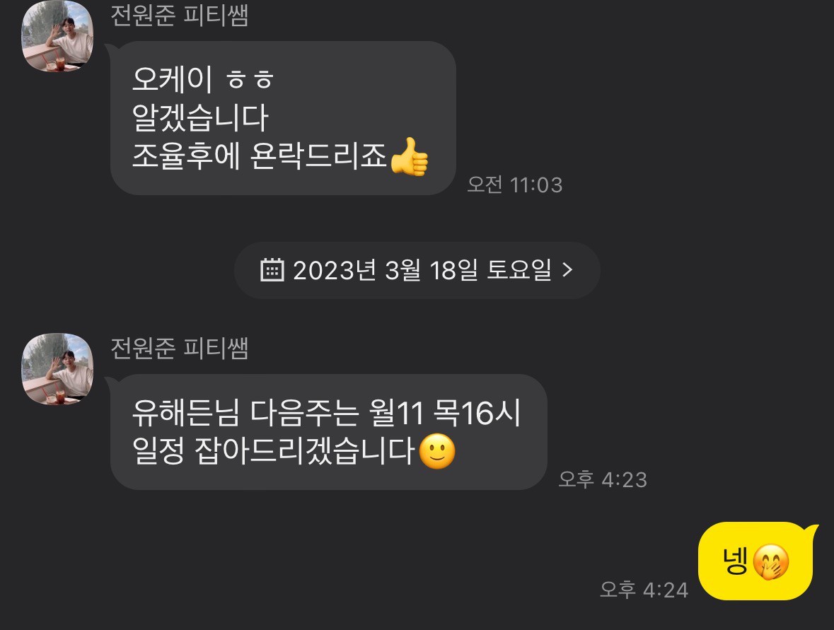 지금은 바로 30회 끊어서 PT 진행 중이네요. 자칫하다간 몸이 더 망가질 수 있는데 수업 진행하고 다음날이나 그 다음 수업시간에 상태 확인해주시고 수업 나가주셔서 안심돼요. 강추합니다~!척추측만증이 심해서 어깨 통증과 허리통증이 많았어요! 혼자 운동을 하기에는 어려움이 많아 원준쌤을 찾아갔는데, 허리에 무리 없이 운동 하는 법, 스트레칭 하는 법 등을 배우면서 통증이 많이 줄어들었습니다. 근육도 꼼꼼히 잘 풀어주셔서 운동 할 때 다치지 않고 할 수 있었어요. 무엇보다 혼자 하려고 하니 막막하기만 했던 운동 시간이 루틴이 생기고 할 수 있는 것들이 생겨 즐거워졌습니다!! 저처럼 운동에 어려움이 많고, 척추측만증 등 통증이 있으신 분들은 원준쌤께 수업 받는걸 적극 추천합니당 ㅎㅎ대학 입학 이후 운동을 전혀 하지 못 하였고, 취직 후에는 불규칙학 생활습관으로 몸이 많이 망가지고, 만성피로에 시달리는 상태에서 건강을 위해 운동을 하기로 마음 먹고 먼저 PT를 받았던 친구의 추천으로 원준쌤과 10개월 간 PT를 진행하였습니다.