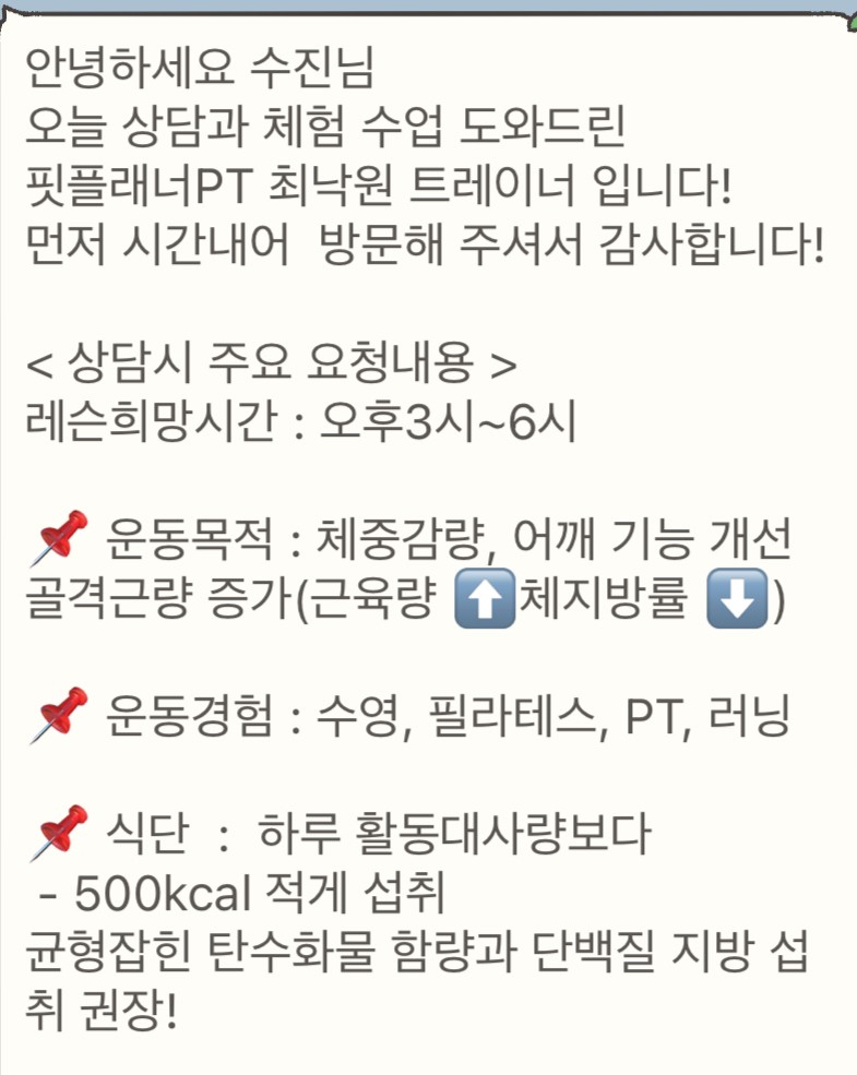 피티 고민하시는 분들께 진심으로 추천드리고 싶은 선생님이에요. 앞으로도 잘 부탁드려요!지인분의 강력추천으로 핏플래너에 등록하게되었습니다.