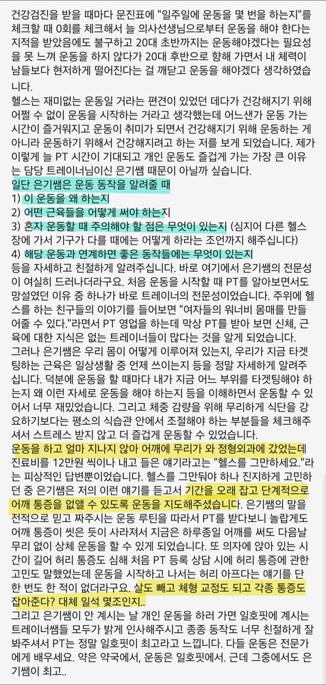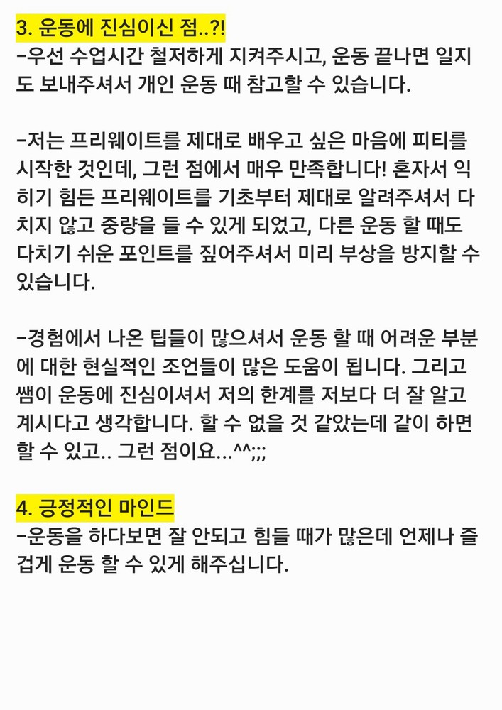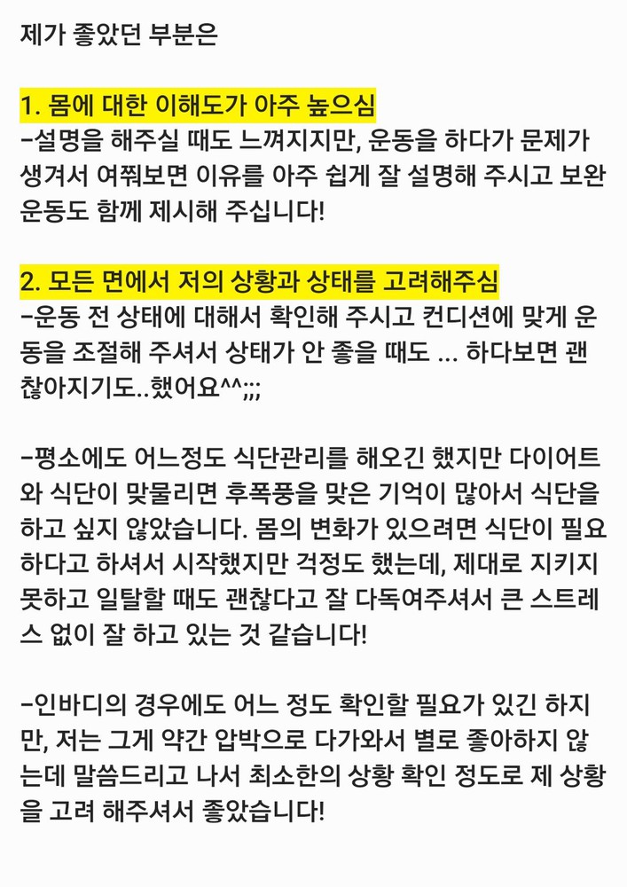 친구같이 얘기도 많이 해주시고 들어주시고 가장 좋은건 운동에 대한 설명등이 자세해서 좋았어요(다른곳은...시키면 무조건해!! 이런너낌?)