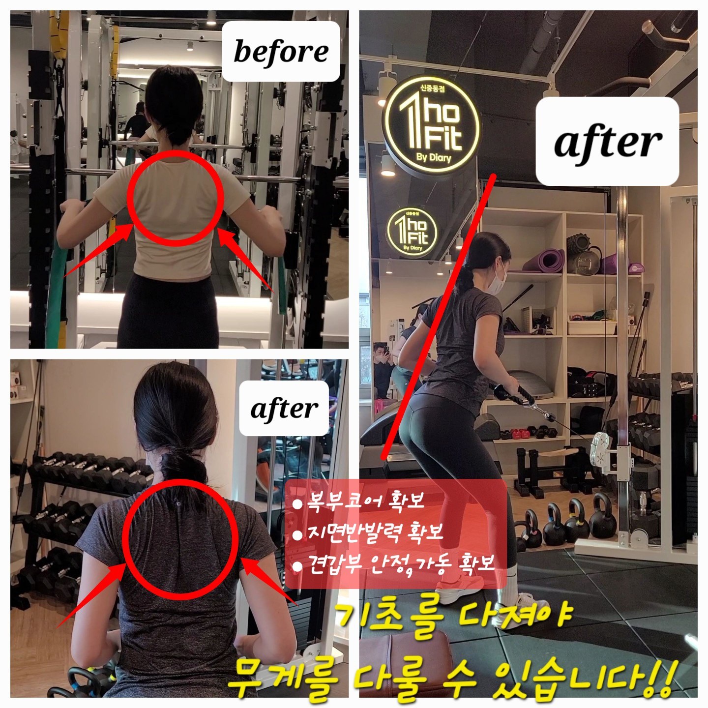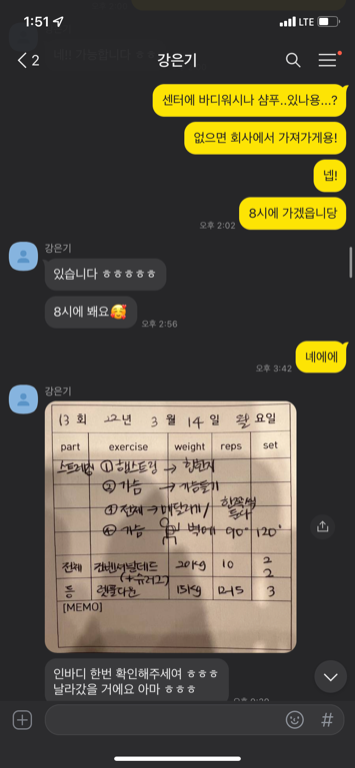 일기쌤은 늘 친절하시구요, 그냥 "스쿼트 할 때 좌우 균형이 안 맞는거 같아요...", "숄더 프레스할 때 왼쪽 어깨가 올라가는거 같아요" 이렇게 애매하게 물어봐도 해결 방법을 정확하게 알려주셔서 pt 20회 등록했고 제 운동수행능력과 체형에 더 적합하게 운동을 배우고 있어서 오늘도 만족스러운 시간을 보낸거 같습니다!
