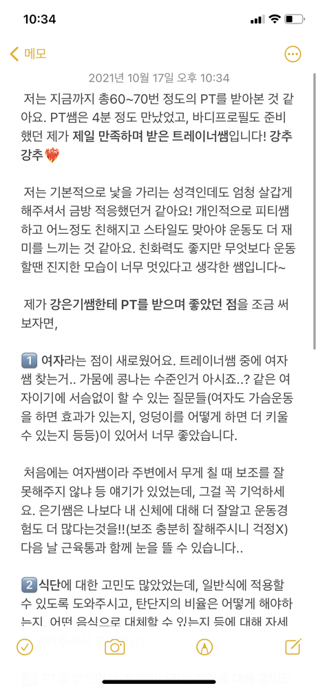 후기를 적으랬더니 일기를 쓰는 기분이긴 한데, 요약하면 일기쌤은 운동에 재미를 붙일 수 있게 도와주실 수 있는 분이고, 운동 부위나 방법 등에 대해 자세히 알고계십니다!