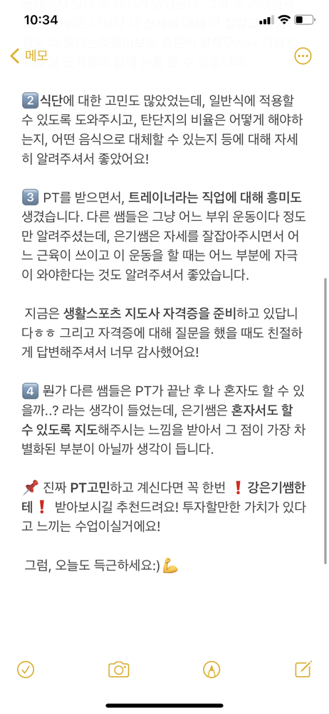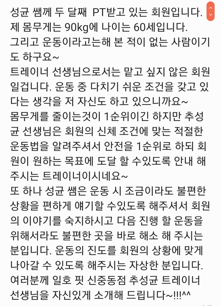 예전에 운동해도 별로 효과가 없어서 고민했었는데 선생님 만나고 몸이 건강해지는게 느껴져서 고민 중이신 분들 꼭 여기서 pt 받아보시는거 추천드려용!!