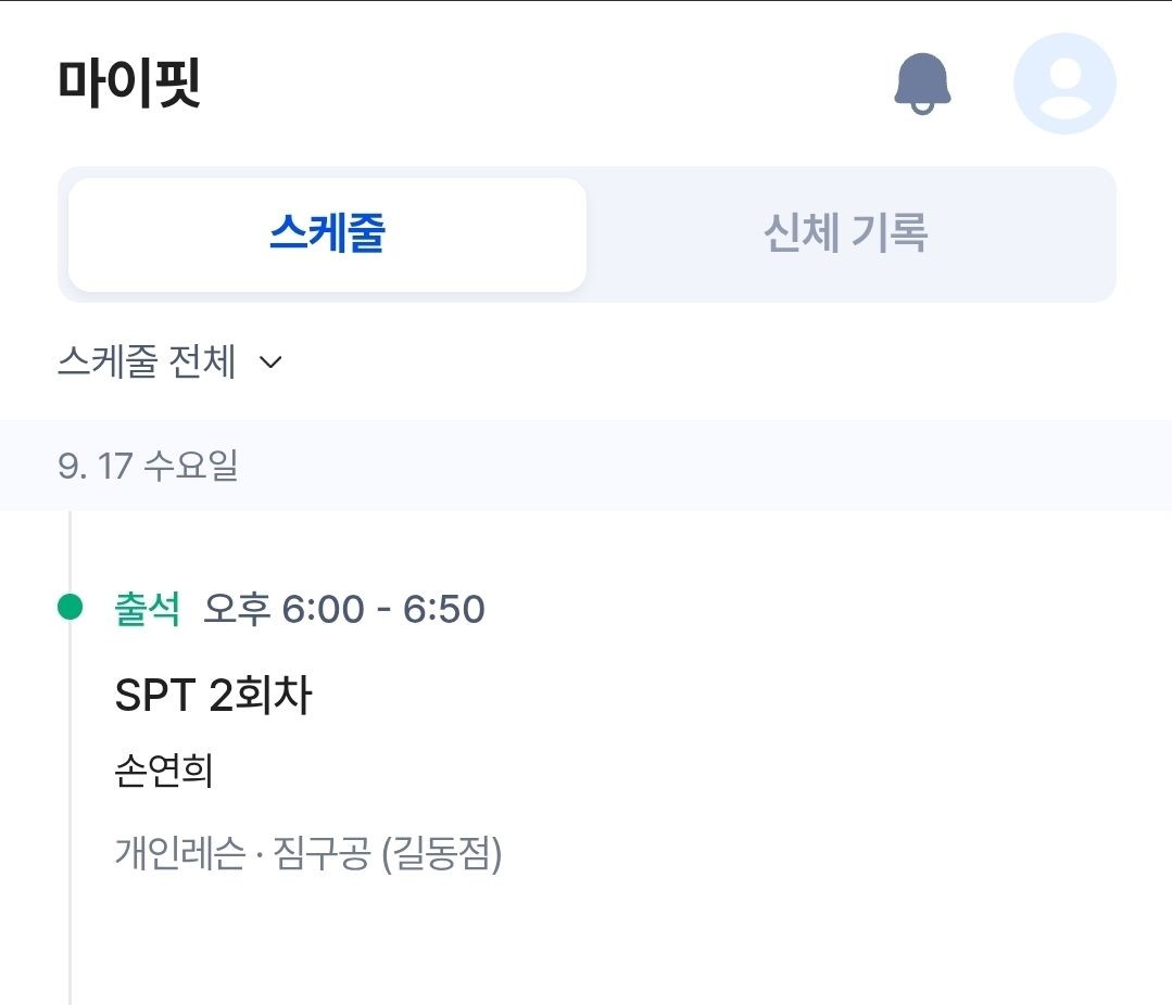 저처럼 운동 초보이신분들께 추천드려요지방에서 대학 합격후 서울로 와서 운동하려 PT 받으려 고민하다 받아보는거여서많이 걱정했지만 트레이너 선생님이 친절하게 대해주시고 운동 관련해서도 자세뿐만 아니라 제 몸에 따라 자세 교정도 해주셔서 체중 감량뿐만 아니라 체형도 교정되서 너무 만족스러워요 PT를 처음 받아보시는데에 고민이시라면 손연희 트레이너 선생님 강추드립니다!!spt후 체형 약점을 알게되었고, 개선에 많은 도움이 될 것 같아 pt를 등록하게 되었습니다.