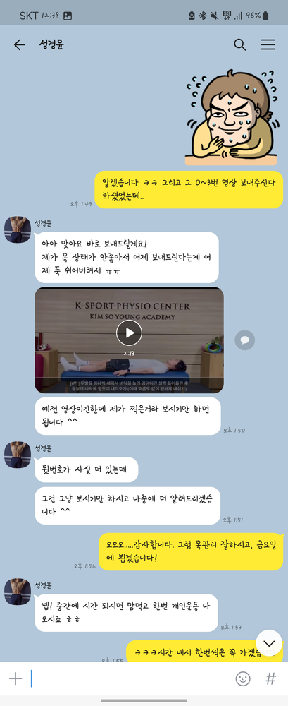 6군데의 디스크 질환과 원인을 알 수 없는 관절통증 및 근육통, 우상완 연골와순 등의 질환이 있었기 때문에 pt받으시는 회원분들 중 제일 까탈스럽지 않았을까 싶습니다.
