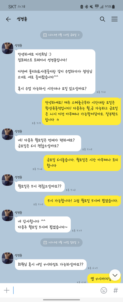 운동하고 싶지만 다친 적 있어서 걱정이거나, 하루 종일 컴퓨터 앞에 앉아있어 몸이 망가지는 중인 직장인이라면 경윤쌤 추천드려요!코치님의 섬세하게 잘 알려주시고 친절하고 좋습니다 감사합니다!운동을 한번도 해보지 않아서 처음 시작할 때 걱정이 많았는데, 선생님이 잘 이끌어 주셔서 부담 없이 운동에 자연스레 재미를 느끼게 되었습니다.
