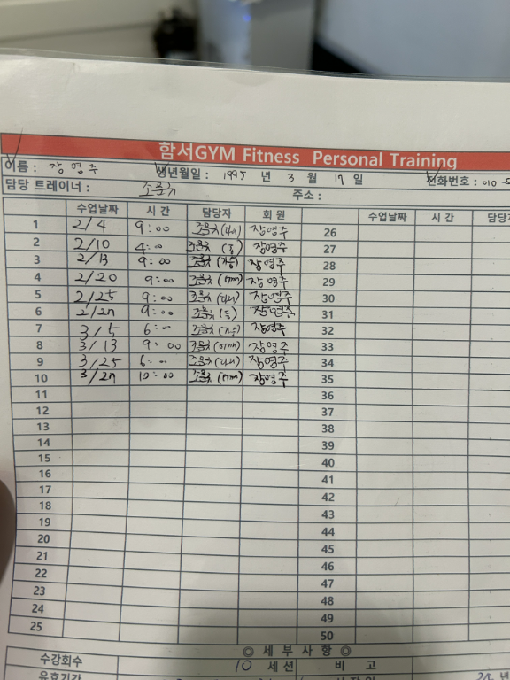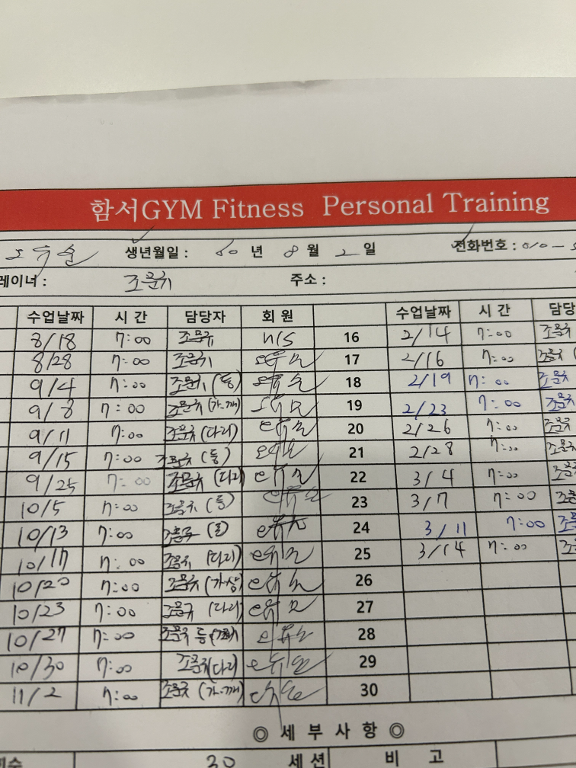 수업기록을 카톡에 보내두면 피드백해주시고 기억하기에도 좋다고하셔서 당시에는 조금 귀찮긴했는데 지금까지도 엄청난 도움이 되구 꾸준히 할 수 있는 원동력이 되었어요! 재밌고 친절하신 문규쌤!! 저만 알기 아까워 진심담아 남깁니다!처음에 헬스장 갔을때 무슨 운동을 해야 할지도 모르겠고 헬스장과 낯가리던 저를