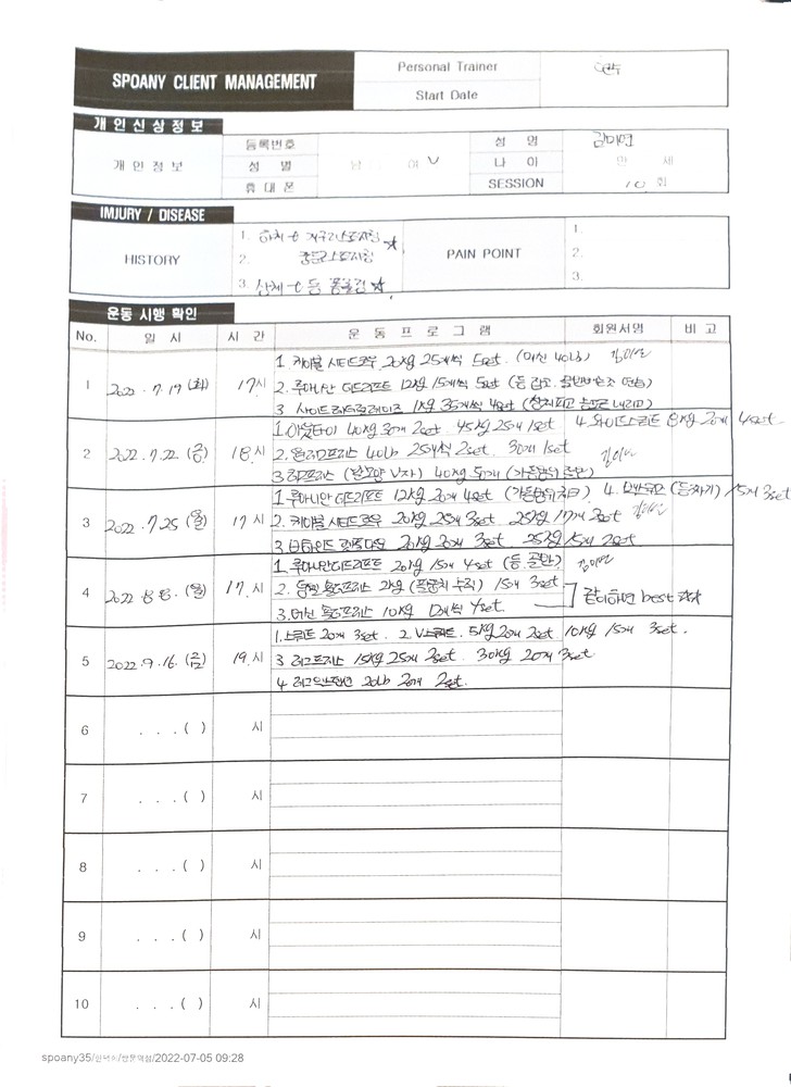 처음엔 담낭제거수술을 하고 약해진 체력과 건강을 위해 운동을 열심히 해보겠노라고 등록을 했는데 제 몸이 그리도 엉망인 몸둥인지 쌤과 함께 운동을 하면서 알게 되었어요. 허리협착통증.무릎관절통증.족저근막염. 어깨근육통증. 정말 성한곳이 없구나 싶었는데 쌤에 재활치료 솜씨는 저를 살려주시는 은인같은 느낌였어요. 꼼꼼히 아픈부위도 체크해주고 연결된 근육들의 쓰임과 또 아파질 부분들까지도 걱정해주시고 조심해야 할부분까지도 체크해주시니 솔직히말해서 병원가서 물리치료 받는 것보다 백번나았답니다. 항상 감동 받는 pt시간예요. 즐겁게 운동할수있게 비타민같은 호탕한 웃음은 덤으로 강력 추전해요