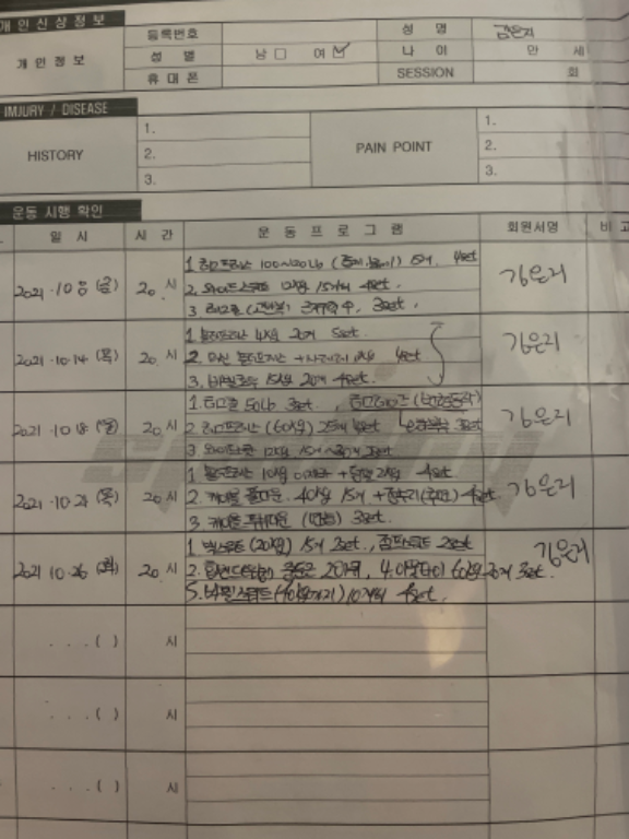 피티 받는날은 힘든데 지나면 일상생활 힘들정도가 아니고 딱 저에게 알맞는 강도로 트레이닝해주시는게 느껴집니다. 받으시는분들 모두 건강해지세요😊