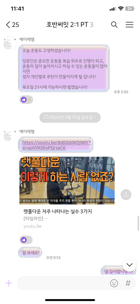 이레 선생님 장점은 꼼꼼하고 섬세하게 수업을 진행해주시는 것 입니다. 제 이야기도 경청해주시면서 몸 관리 관련 어드바이스를 많이 주셔요ㅎㅎ 앞으로도 선생님과 건강하게 운동하고 싶어용ㅎㅎ