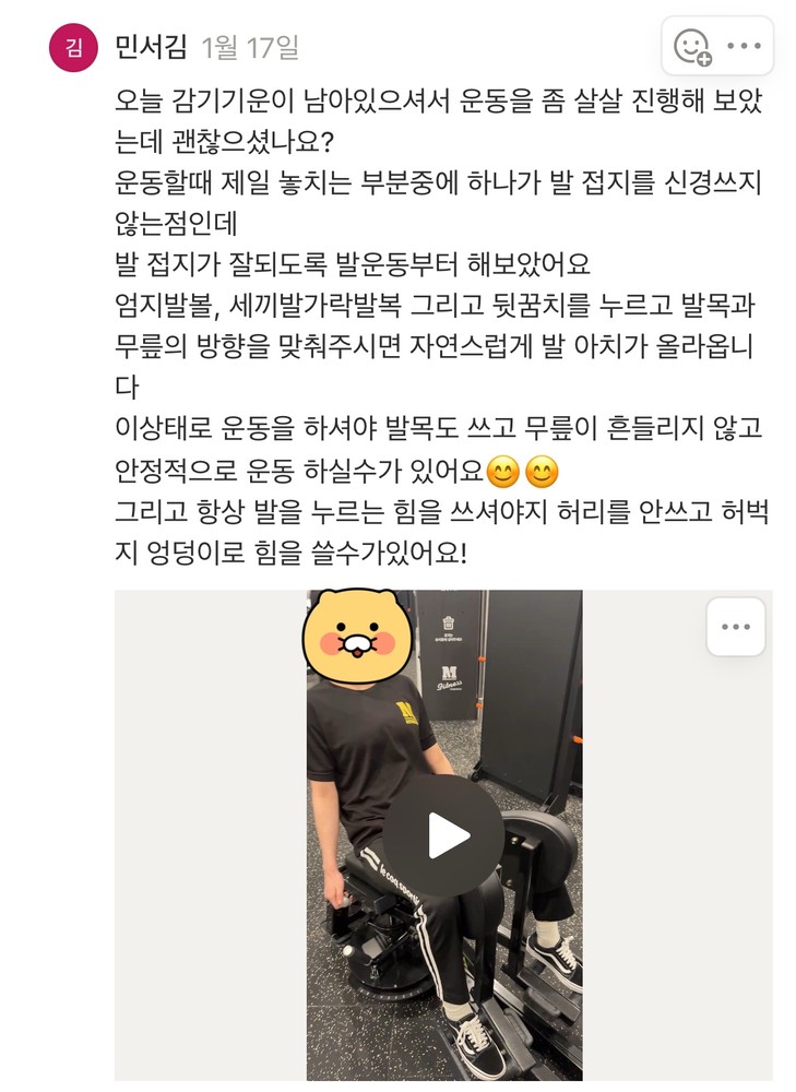 자극이 어디에 와야하는지, 잘 오고 있는지, 그리고 그 후에도 어느 부분에 근육통이 오는지까지 챙겨주셔서 그 부분에 집중하려다 보니 좀 더 운동에 집중이 잘 되는 것 같아요 ㅎㅎ