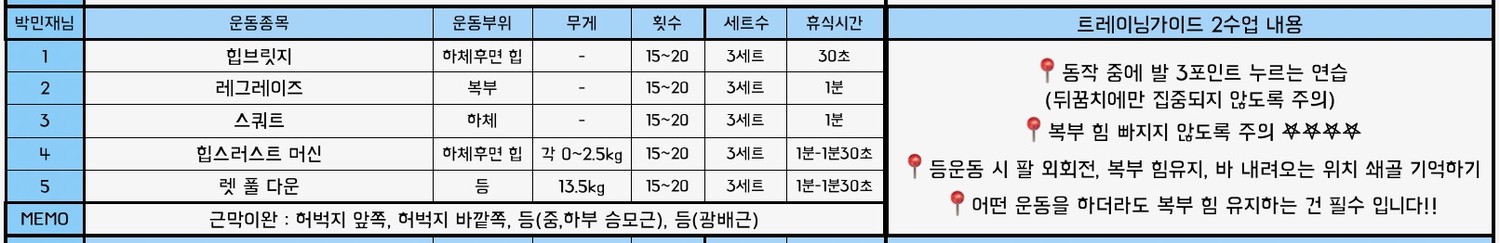 네이버 밴드로 운동일지를 작성해주시고 루틴을 잘 짜주셔서 PT시간이 아닌 혼자 헬스를 할때 참고하기 좋아 운동을 효과적으로 지속할 수 있는 것 같습니다.