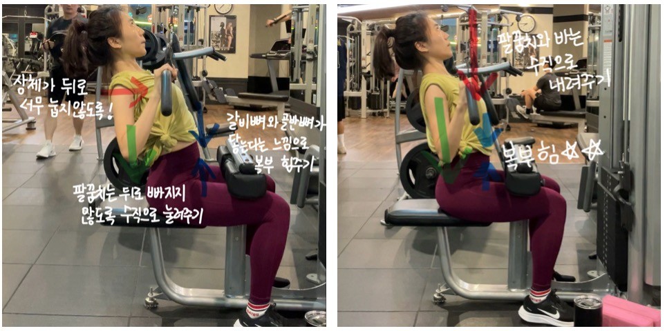 [운동방법] 그전에 답답하던게 운동기구별로 어떻게 힘을 쓰고 특정 근육을 쓰는지 몰랐는데 다혜쌤 알려주신대로 하다보니 어느새 복압잡고 광배근에 힘주고잇더라구여 ㅠㅠ