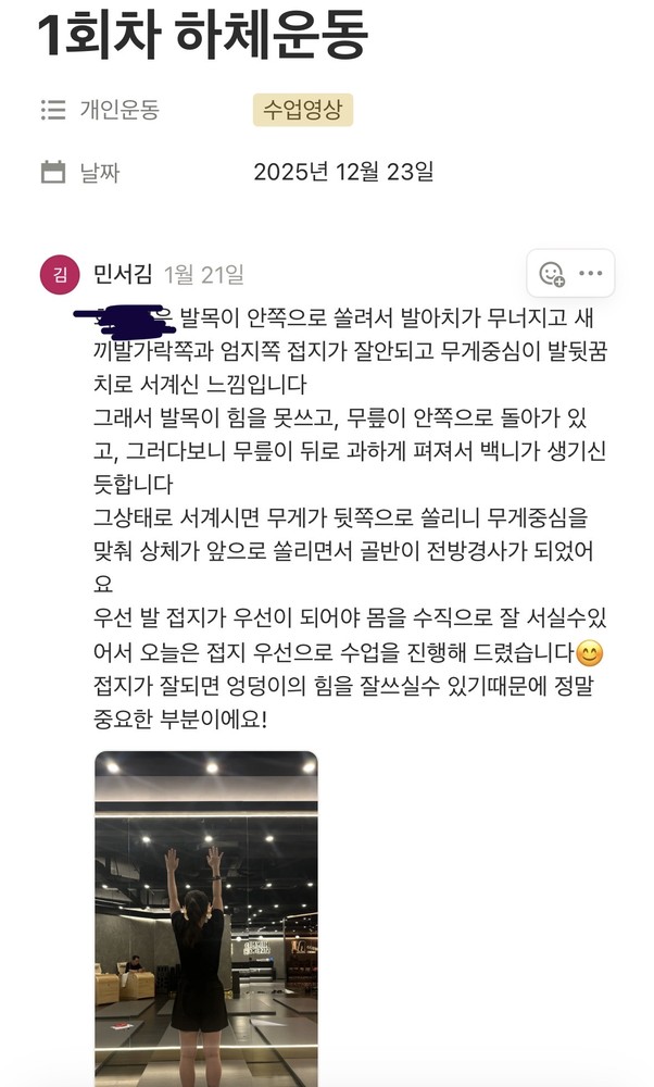 피티시간에 배워도 항상 까먹는게 운동인데 노션으로 꼼꼼하게 피드백 해주시고, 영상 및 오늘 운동한 내용을 정리해줘서 복습할 때 도움이 많이 됐습니다.