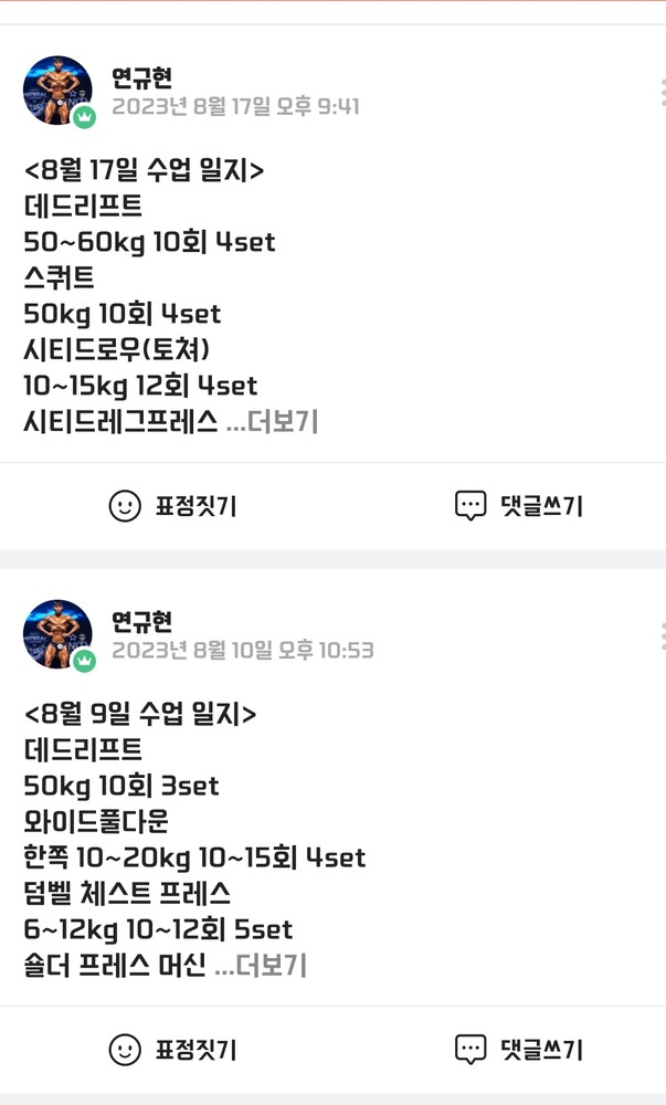 운동한거 밴드로 쌤이랑 회원만 보는 운동일지 작성해서 공유해주시고,