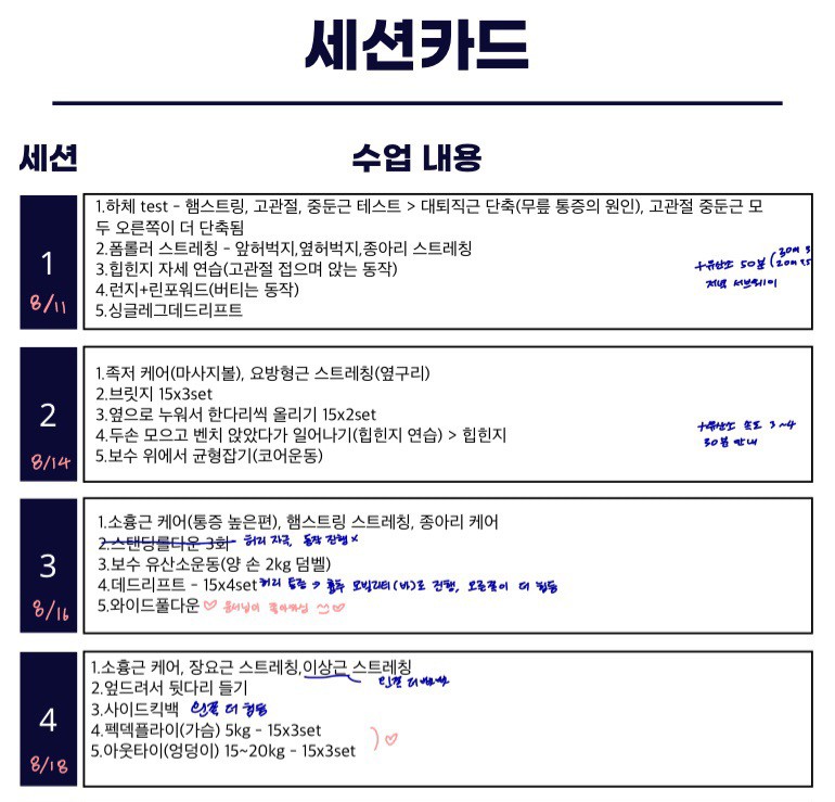 안녕하세요 수미님 ! 하이엔드핏PT 김현진 트레이너입니다 ☺️ 수미님은 근력향상,특히 힙과 등 고민으로 방문해주셨는데요 ! 힙과 등은 근막으로 이어져있고, 힙을 키우고싶으면 등도 함께 키우는게 맞다는 말에 신기해해주셨던게 기억납니다 ! 체형에도 관심이 많으셔서 제 설명도 쏙쏙 이해해주시고, 자극점도 잘 찾으셔서 ! 그만큼 효과도 더 보고계시죠 :) 특히 힙은 50분 수업끝나고나서 효과가 바로 보여서🏋🏻👍저도 뿌듯하고 재밌습니다 ! 앞으로의 남은 수업도 수미님께 최대한 많은 도움 드릴수 있도록 열심히 준비하겠습니다 🤍 화요일에 뵙겠습니